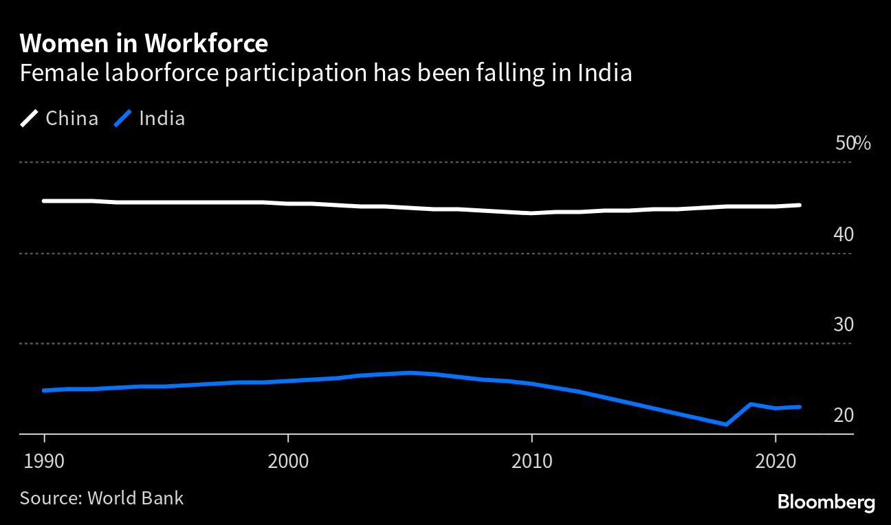 Though they make up 48% of the population, Indian women contribute only around 17% of GDP, compared to 40% in China. Closing the employment gap between men and women could expand India's GDP by close to a third by 2050, which equates to nearly $6 trillion in constant US dollar terms, according to a recent analysis from Bloomberg Economics.