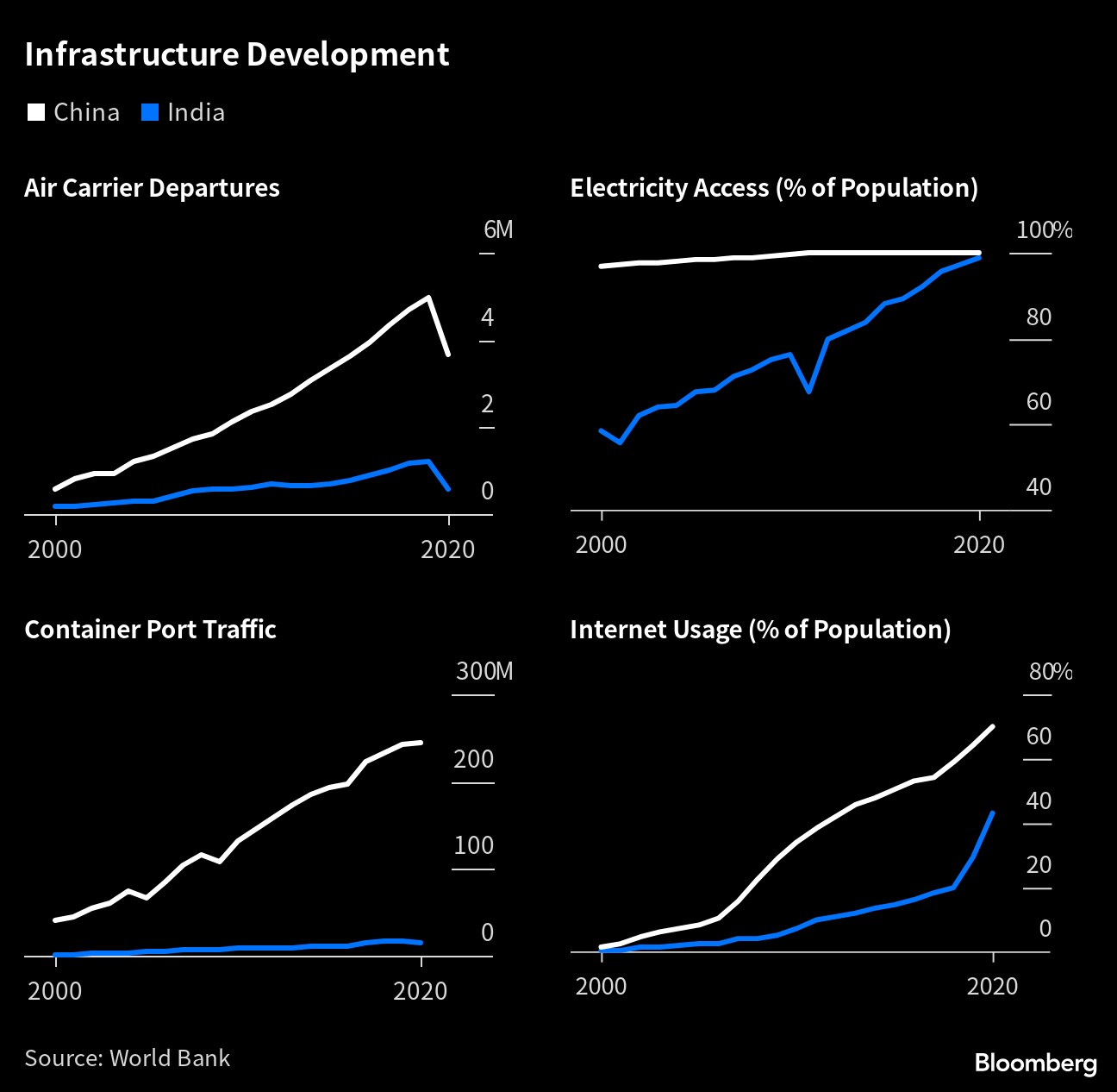 But on other measures, China is still far ahead. Though India has some of the lowest phone tariff rates in the world, internet usage trails China, which has also zoomed past India on everything from air carrier departures to container port traffic.
