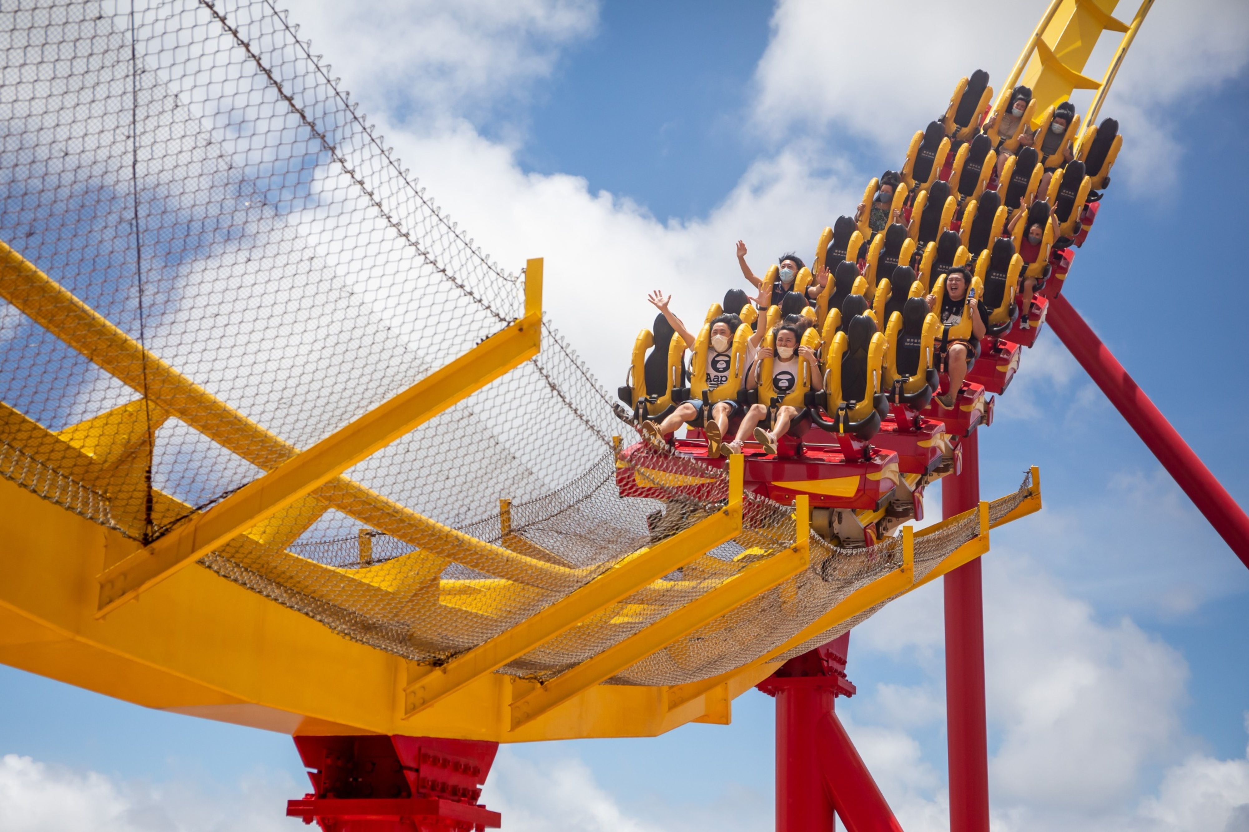 Visitors wearing protective masks ride a roller coaster, on June 13, 2020. (Photographer: Paul Yeung/Bloomberg)