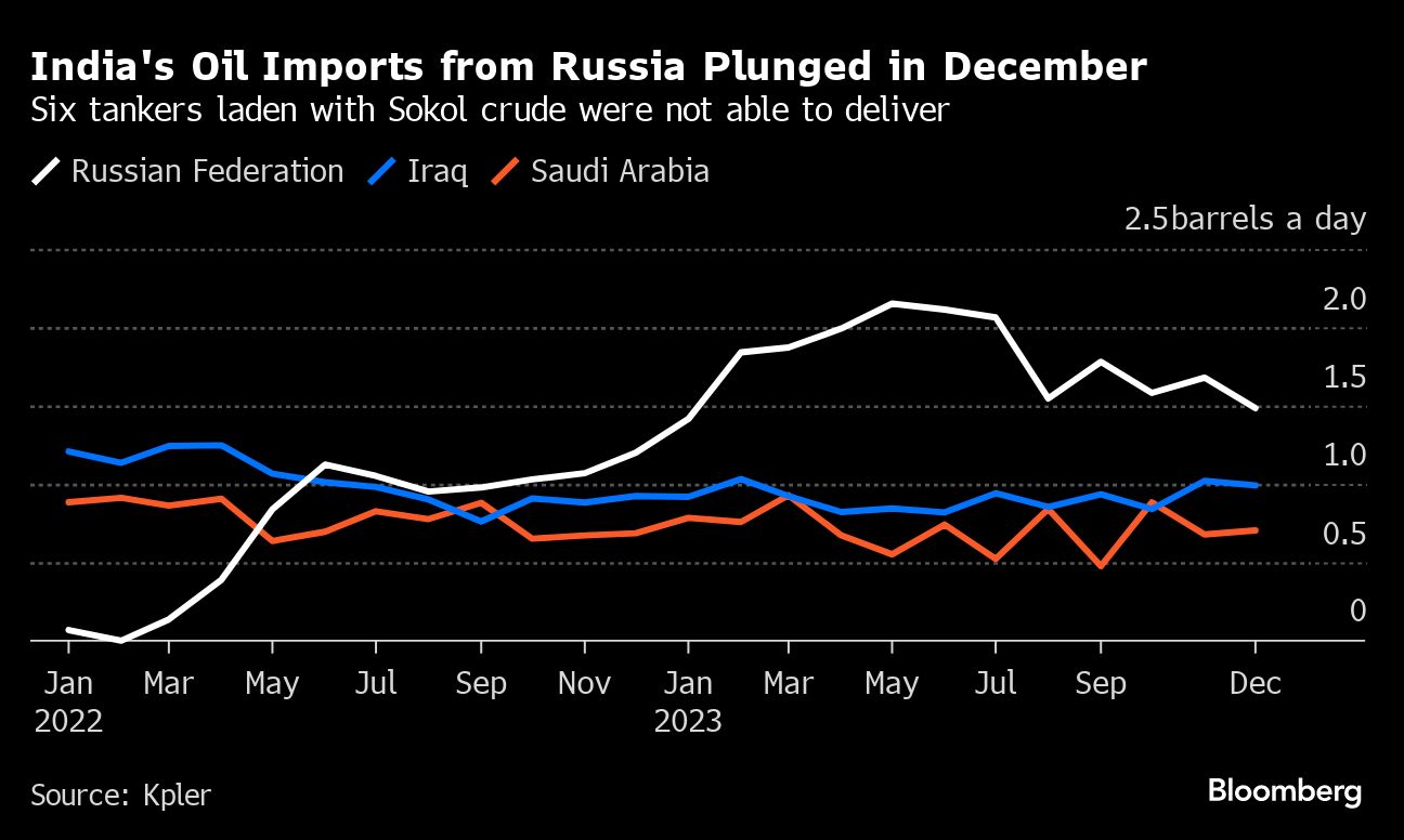 (Bloomberg) -- India's crude oil imports from its largest supplier Russia plunged in December to their lowest since January 2023, as six tankers carrying Sokol grade oil could not deliver due to payment issues amid tightening sanctions, according to data intelligence company Kpler.