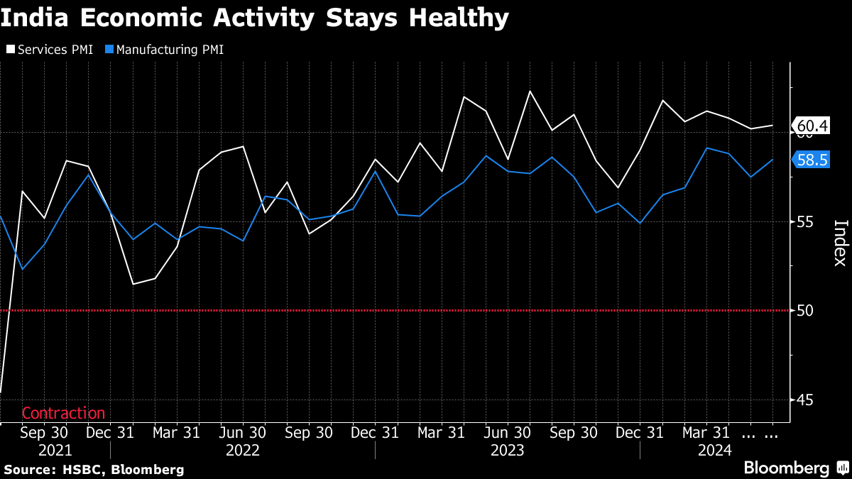 (Bloomberg) -- India's economic activity continued to expand in June, driven by strength in both services and manufacturing sectors, according to a flash survey by HSBC Holdings Plc.