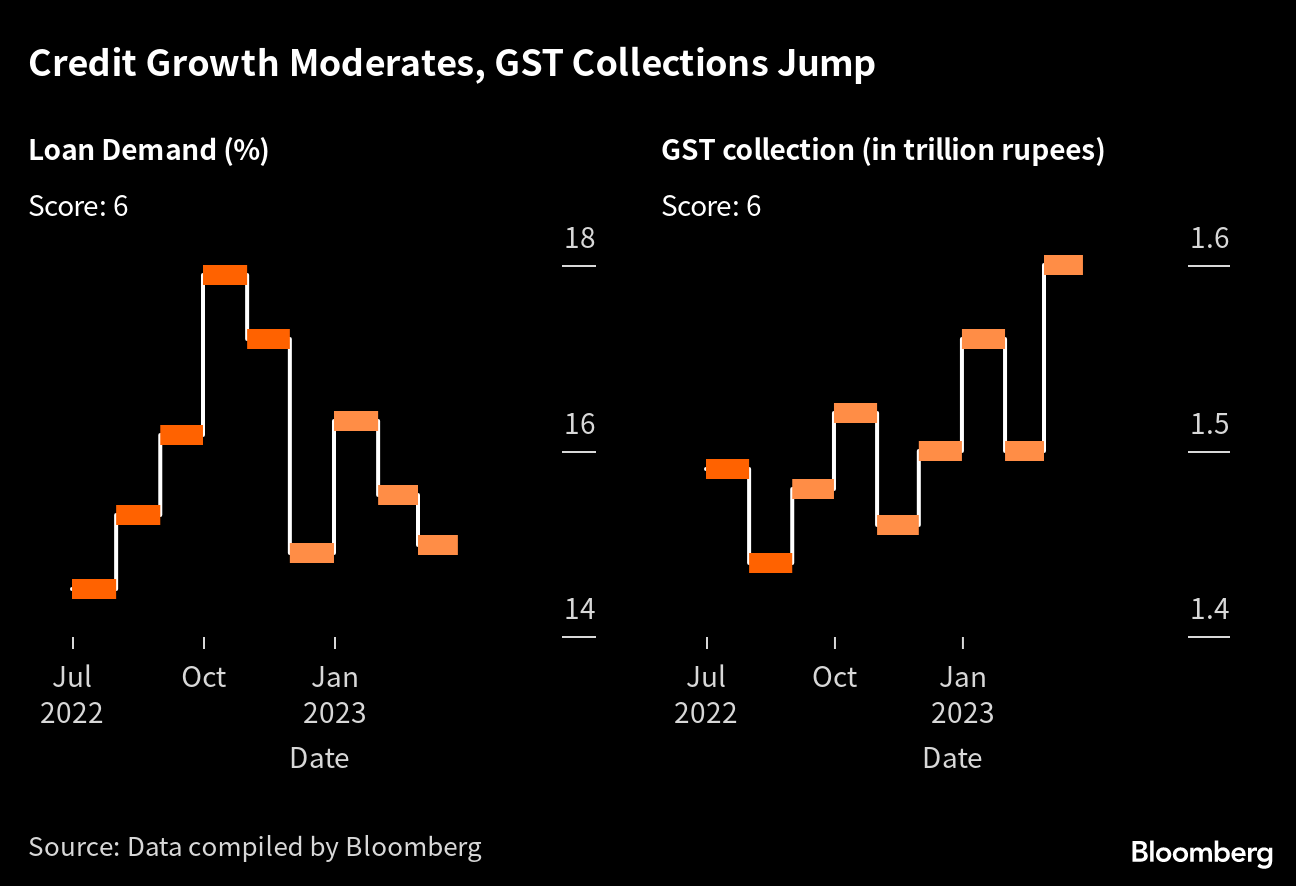 Goods and services tax collections, which help measure consumption in the economy, rose 13% from a year earlier to 1.60 trillion rupees ($19.5 billion) in March — the second-highest level in the history of the six-year-old levy.