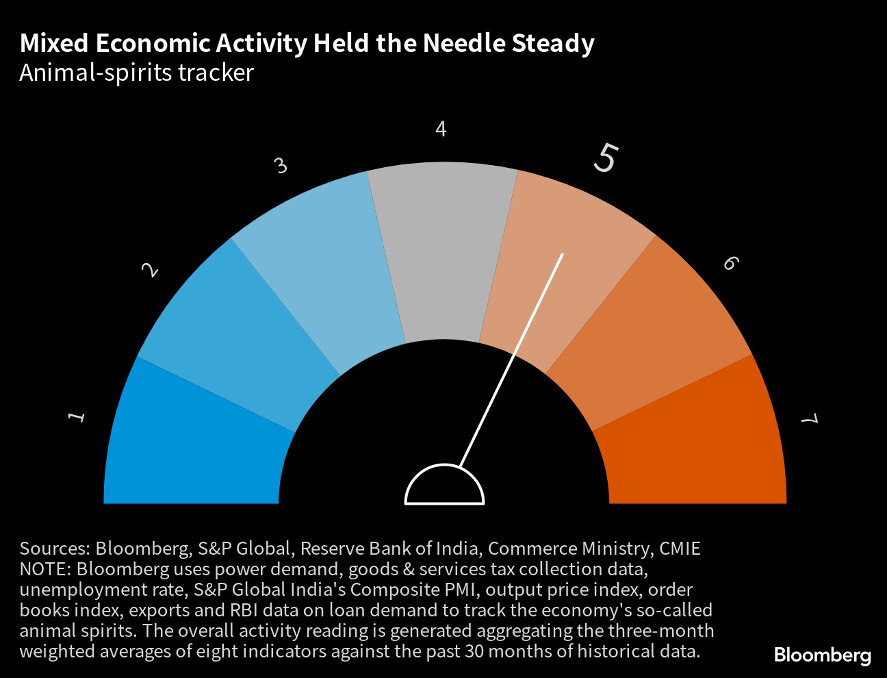 While the needle on a dial measuring the so-called Animal Spirits was unchanged at 5 for a third straight month, a jump in collections from taxes levied on consumption showed Asia's third largest economy was ticking along. That's the reading from the overall activity tracker comprising of eight high-frequency indicators compiled by Bloomberg.