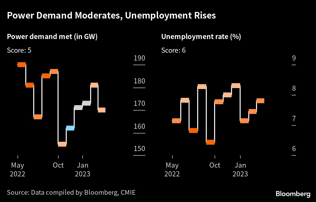Electricity consumption, a widely used indicator to measure demand in the industrial and manufacturing sectors, has moderated. Peak demand in March fell to 170 gigawatt from 181 gigawatt a month ago and soaring temperatures across India could well increase power consumption in the months to come. The unemployment rate climbed to 7.80%, from 7.45% a month ago, according to data from the Centre for Monitoring Indian Economy Pvt, as companies tightened purse strings after the festive season.