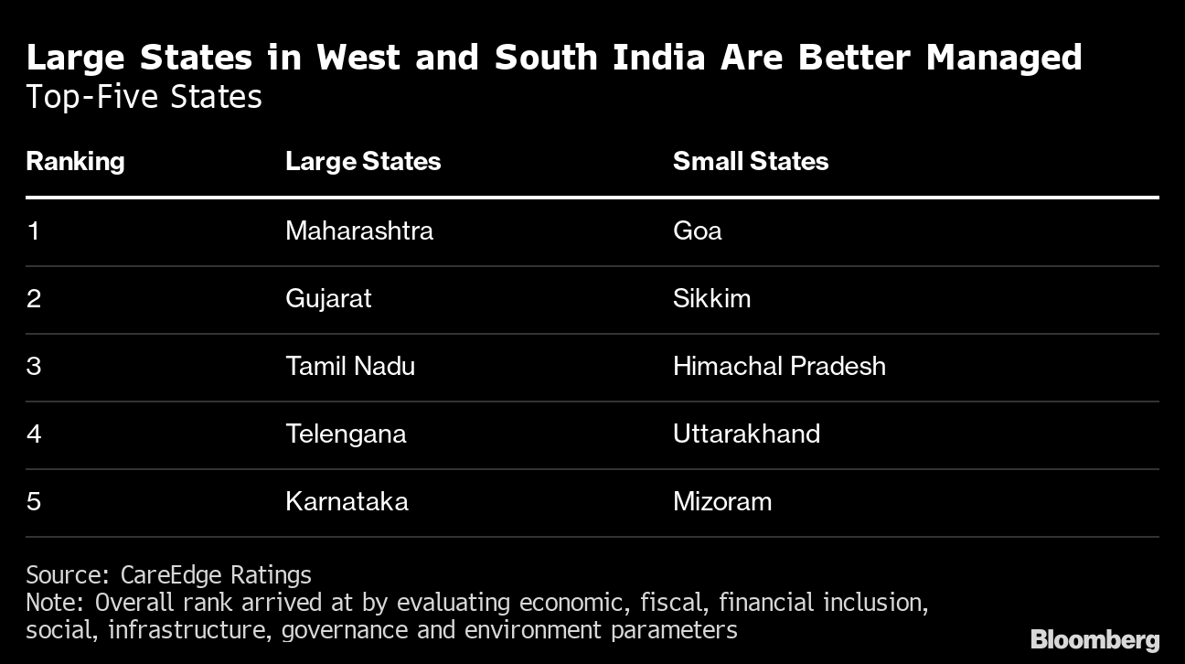 The rankings, released by CareEdge — research arm of Care Ratings Ltd. — also painted a favorable picture of Prime Minister Narendra Modi's home state of Gujarat that boasted of robust economic growth and fiscal management, while India's most industrialized state of Tamil Nadu ranked third with an edge in social and governance categories.