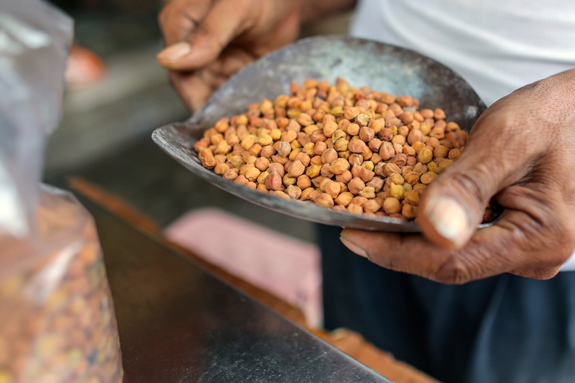 An employee holds a scoop of chickpeas in a store at a local market in Hyderabad, India.