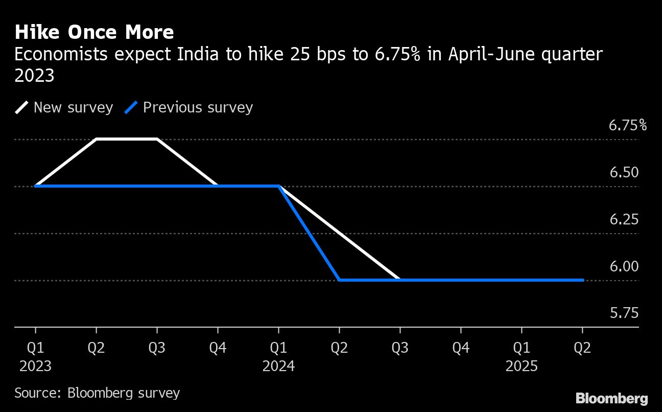 (Bloomberg) -- The Reserve Bank of India is set to lift its benchmark interest rate by another quarter-point to tame inflation that accelerated faster than expected last month, according to a Bloomberg survey of economists.