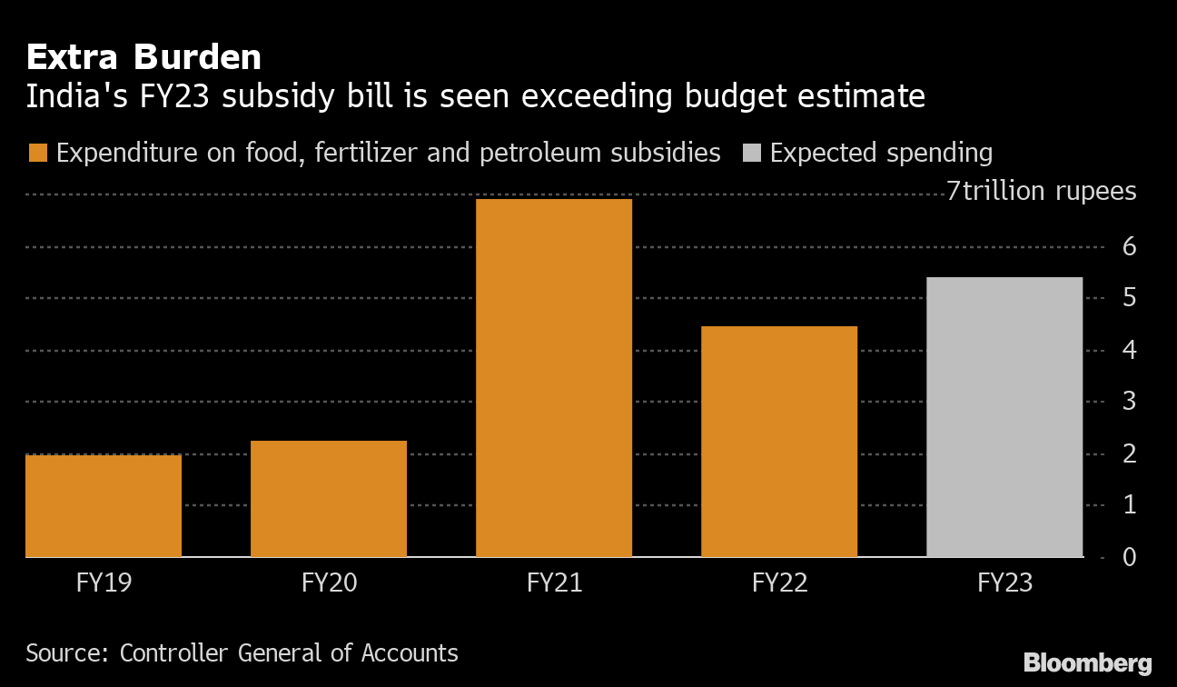 Asia's third-largest economy is grappling with an inflated subsidy bill after a series of challenges from the pandemic to the war in Ukraine boosted commodity prices. For a third straight year, India is on course to miss its subsidy estimates, which comprise a 10th of the total government expenditure.