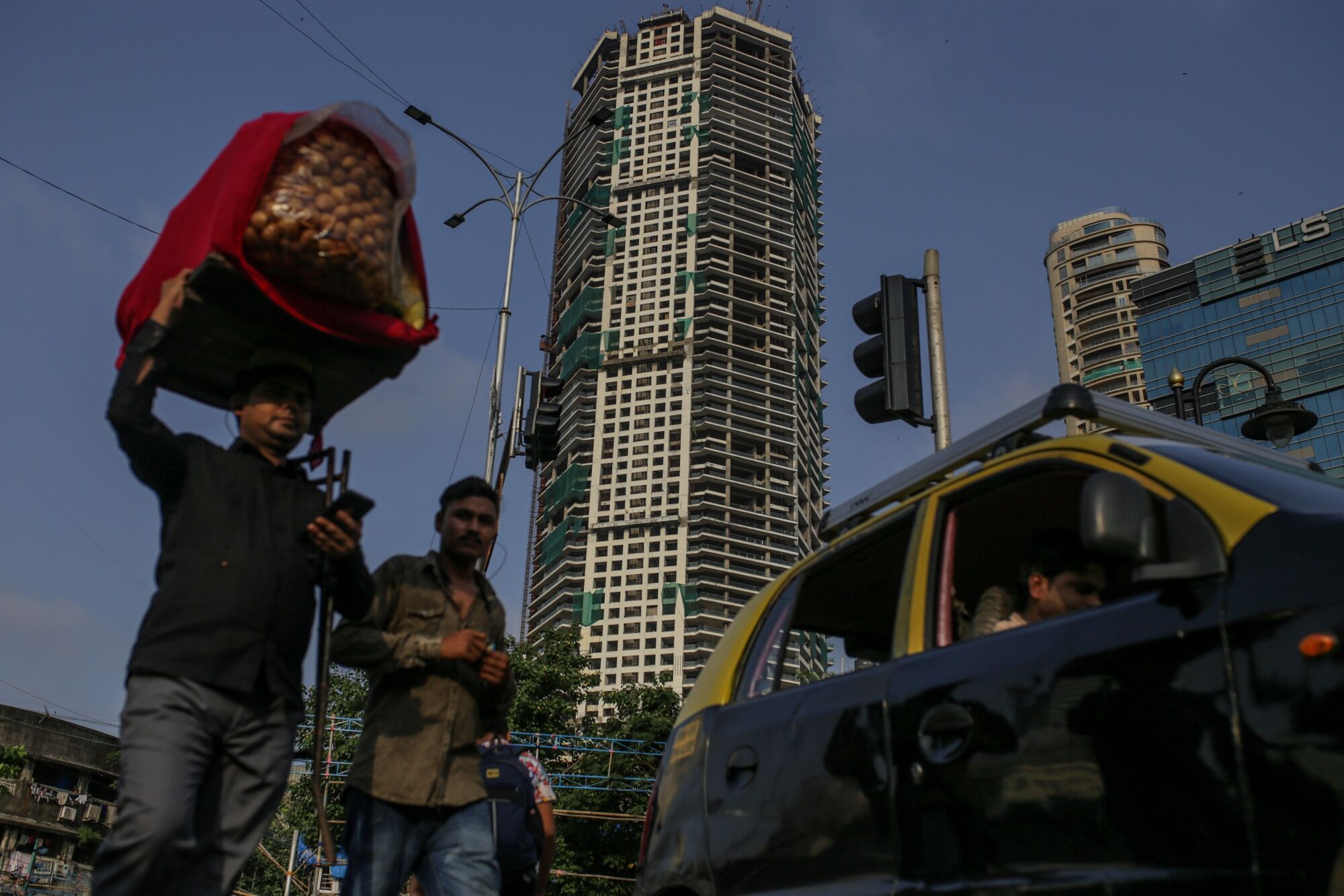 A street food vendor, left, in front of a building under construction at the Lower Parel area in Mumbai, India, on Wednesday, Oct. 4, 2023. India’s central bank added more firepower to its inflation-busting toolkit as the nation’s entry into global bond index is set to test policymakers’ resolve to manage billions of dollars of inflows that could further fan price pressures.