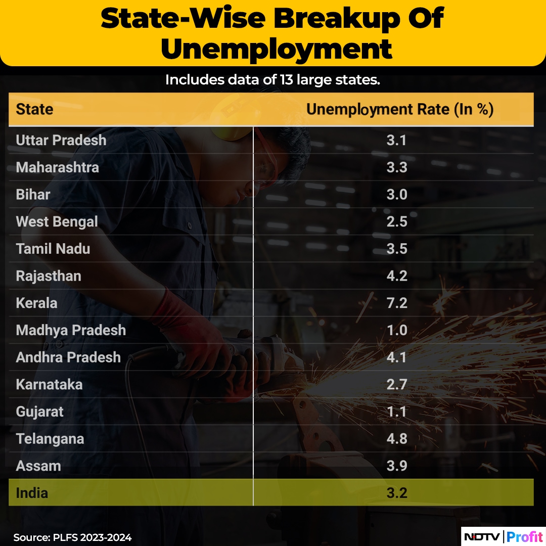 The unemployment rate remains unchanged at 3.2% in 2023–24 for urban and rural areas. Among large states, Kerala reported the highest joblessness at 7.2%, while Madhya Pradesh reported a 1% unemployment rate.