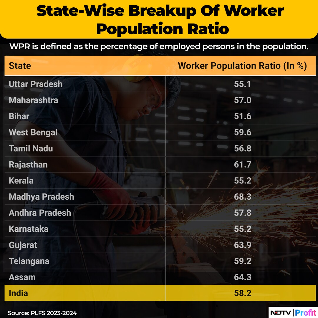 The worker population ratio, defined as the percentage of employed persons in the population, rose from 56% in the previous survey to 58.2% during July 2023–June 2024.