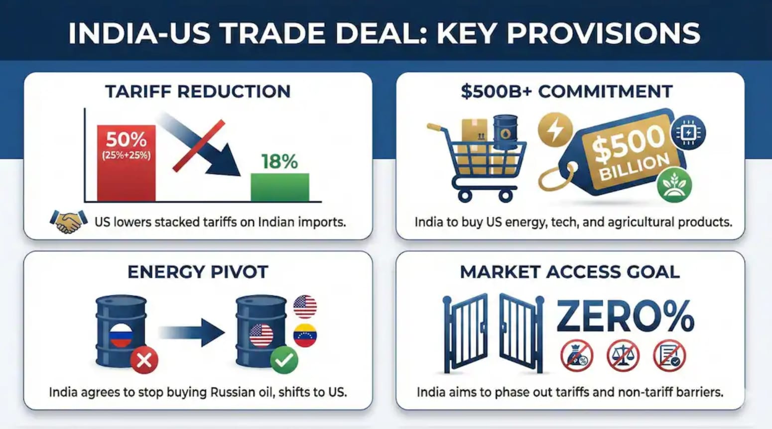 India and the United States have agreed to a trade agreement under which reciprocal tariffs on Indian goods will be slashed to 18% from 25% and the additional 25% duty linked to the purchases of Russian crude oil will be eliminated.