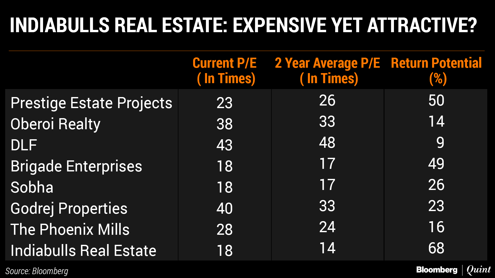 The company offers the highest return potential among peers, according to a consensus of analysts tracked by Bloomberg. That's when the real estate basket faces selling pressure with the Nifty Real Estate index declining 20 percent year-to-date— eight of the 10 stocks ending in the red.