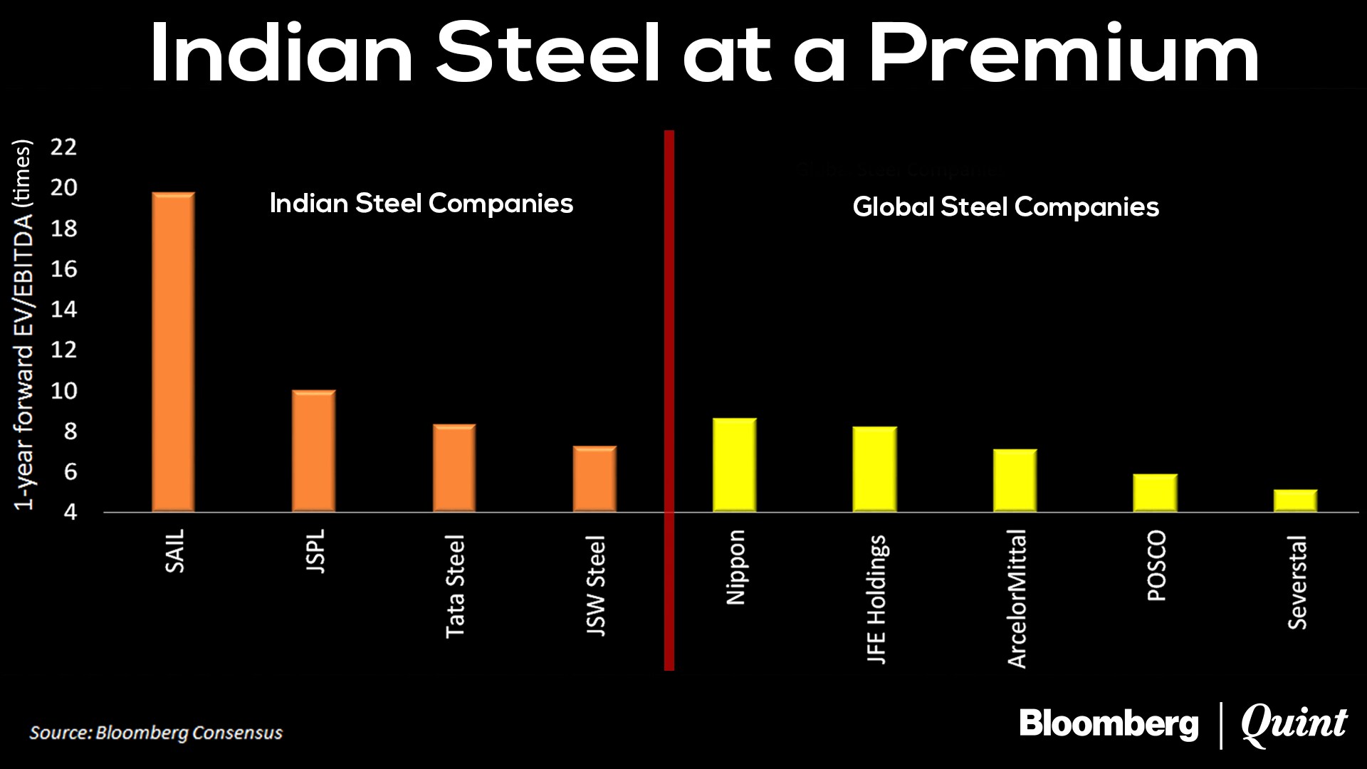 Indian steel companies are currently trading at higher valuations comparedto global steel giants, according to data compiled by BloombergQuint.
