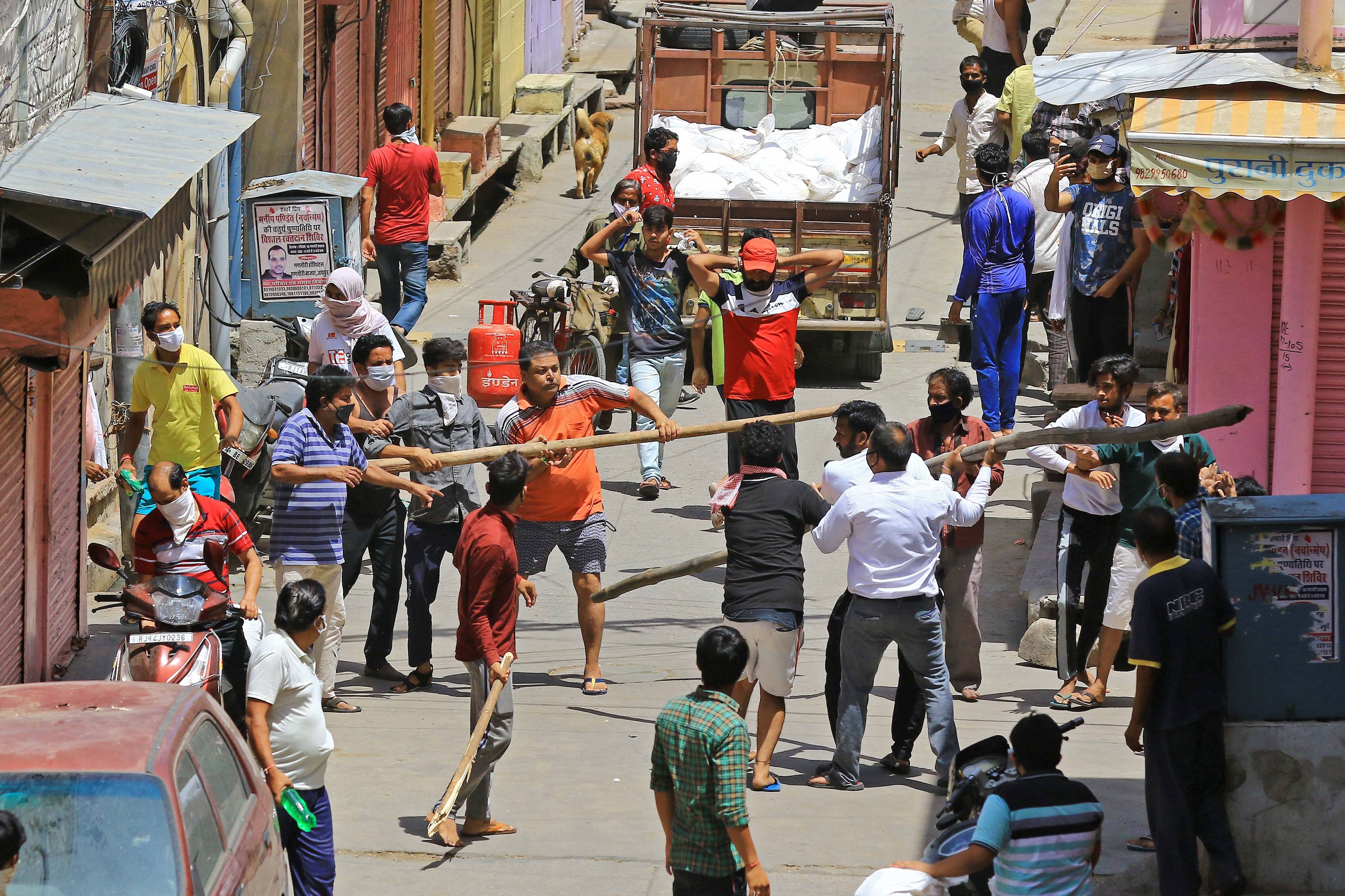 A group of people engage in a scuffle during ration distribution at Chandpole Bazar in Jaipur on Saturday, May 9, 2020. (Photo: PTI)