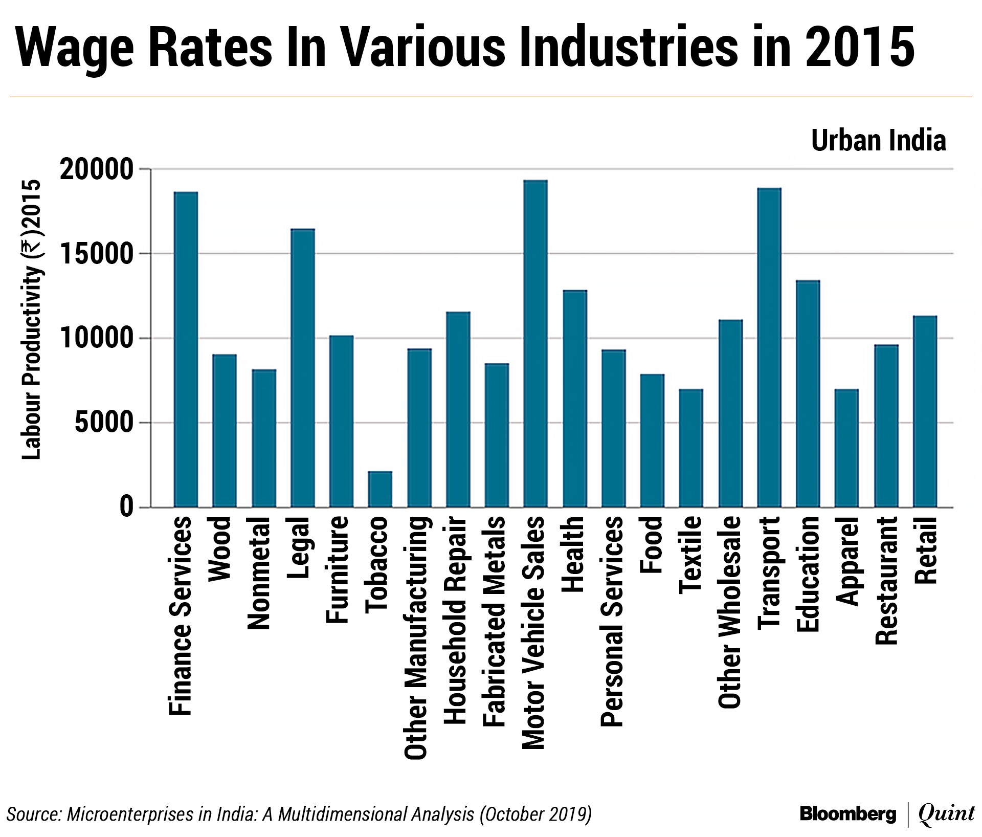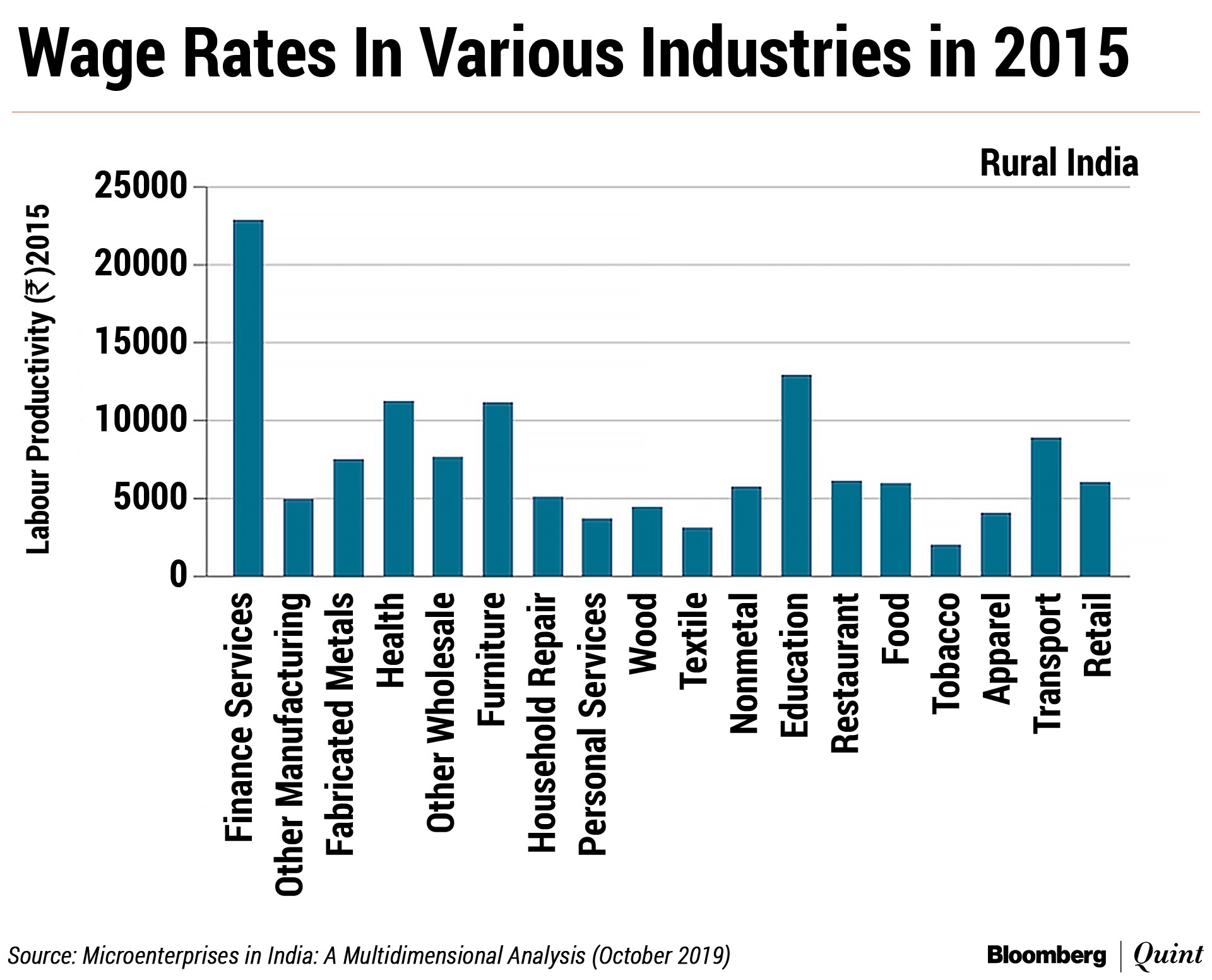 In 2015, among microenterprises that were large employers, the lowest wages and productivity were reported by the rural tobacco industry. The average monthly wage here worked out to less than Rs 5,000 per worker per month, as per the study. The highest productivity was in the education sector in rural areas--nearly Rs 13,000 per month per worker--as was the highest wage level (Rs 10,000).