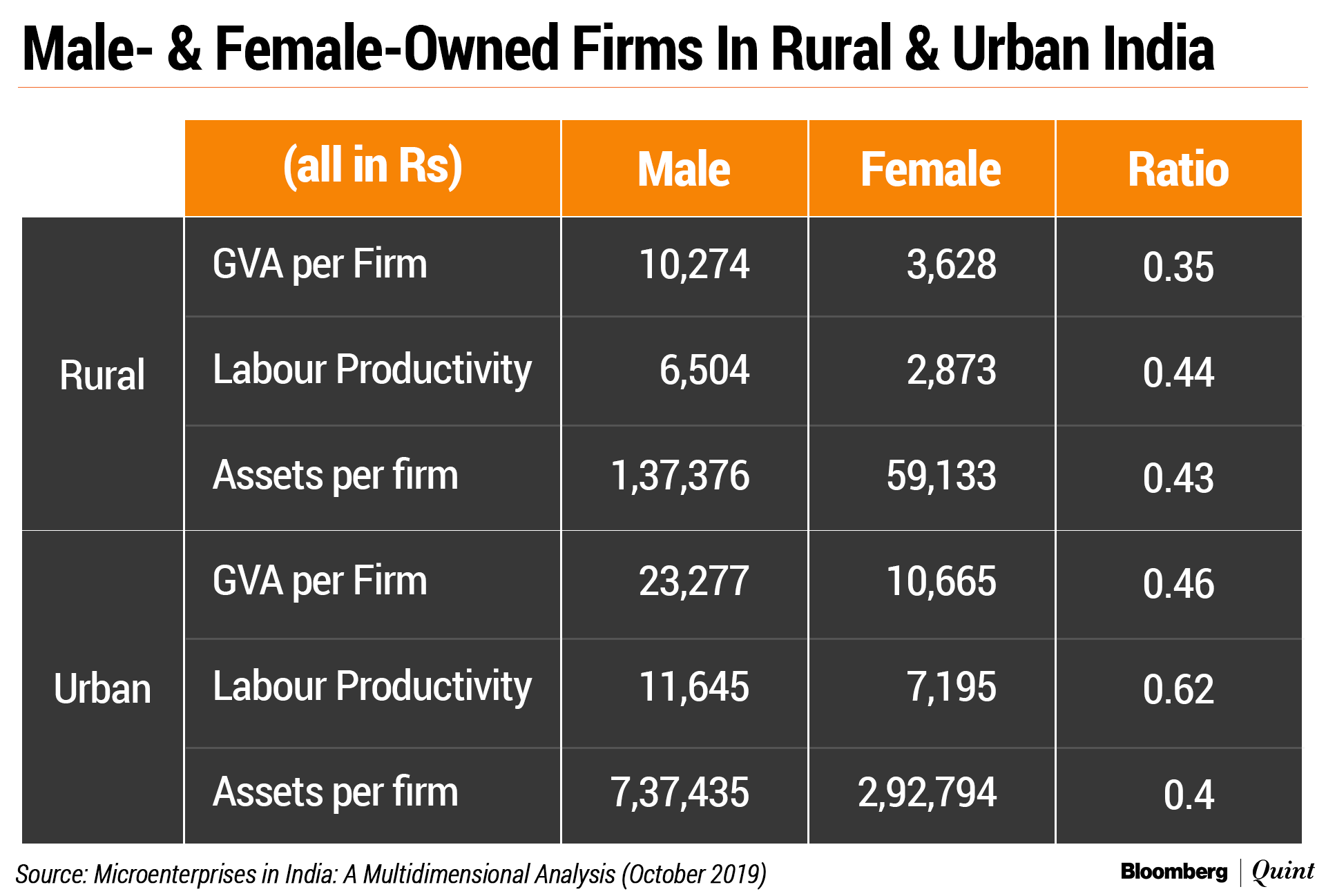 In urban India, the gross value added per firm for female entrepreneurs was 46 percent of male-owned firms, labour productivity was 62 percent and assets-owned 40 percent. In rural areas these figures stood at 35 percent, 44 percent and 43 percent respectively. Both in urban and rural India, 10 industries accounted for over 90 percent female-owned firms.
