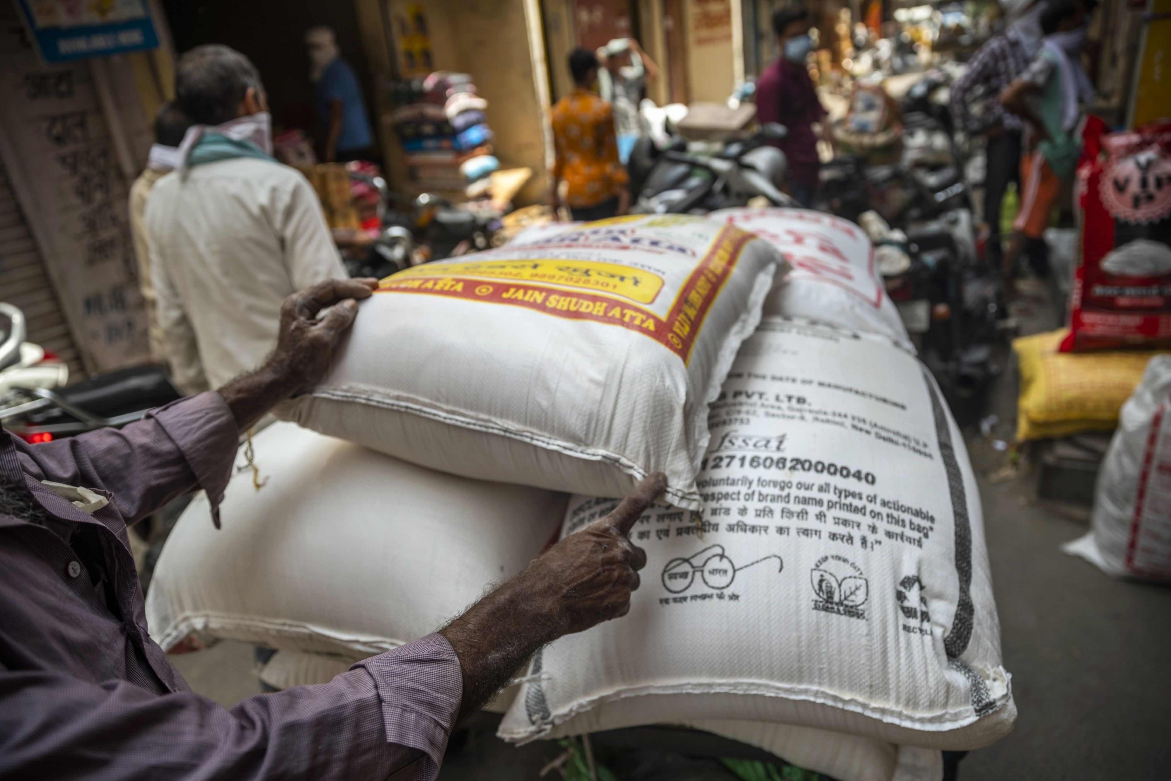 A worker prepares to unload sacks of wheat flour at the Kondli Wholesale Market in Noida, Uttar Pradesh, India. (Photographer: Prashanth Vishwanathan/Bloomberg)