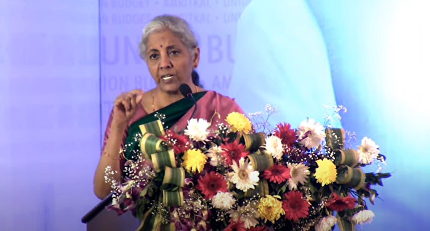 Screengrab of the Finance Minister's address in Bhubaneswar. (Source: BQ Prime)