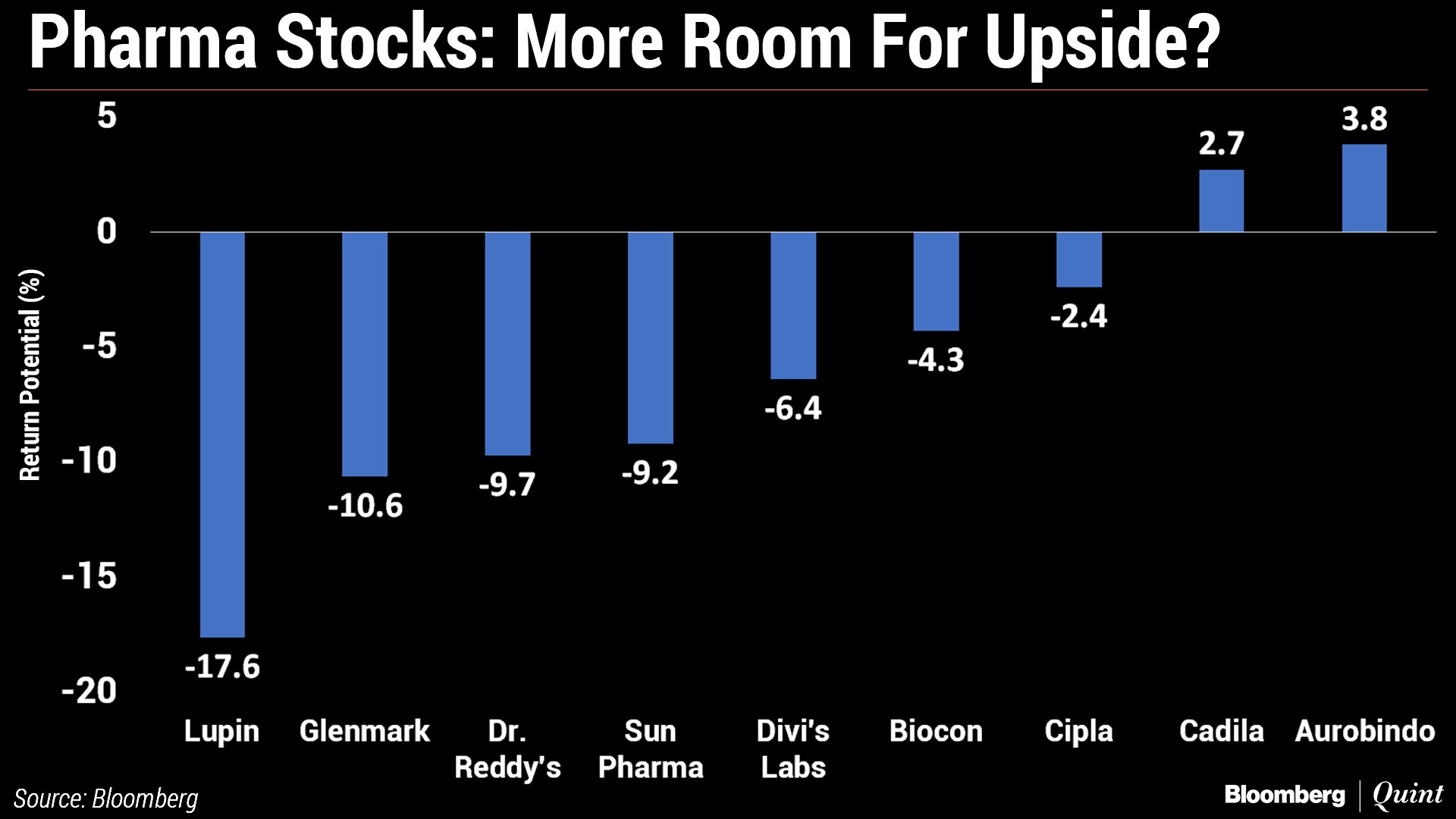 But analysts expect no or a little upside. Seven of these nine stocks are expected to fall in the range of 4-18 percent, according to Bloomberg consensus. Only Cadila Healthcare and Aurobindo Pharma—the cheapest stocks of the lot—have a positive return potential of only 2.7 percent and 3.8 percent, respectively.