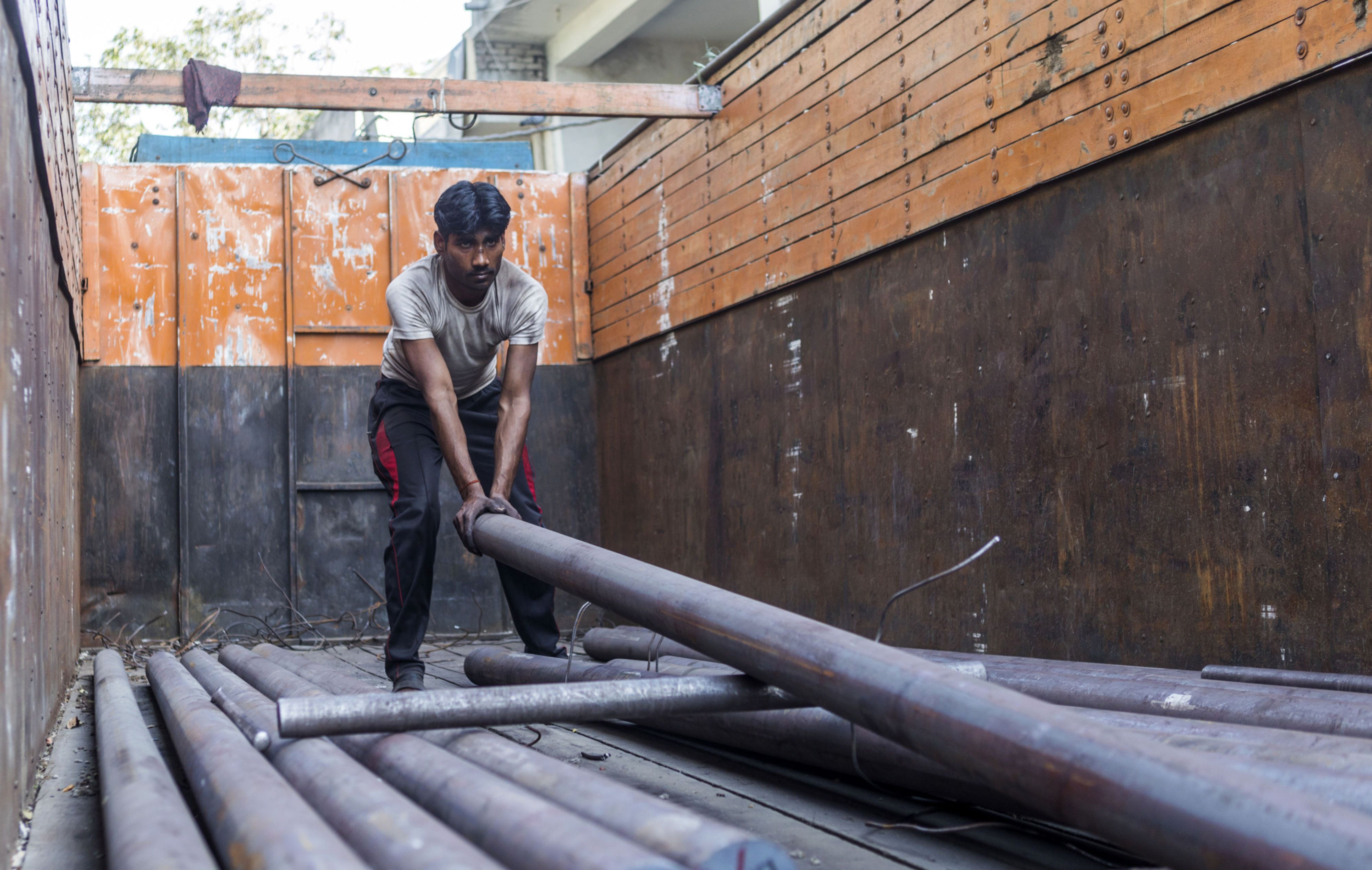 A worker pulls an iron pipe onto a truck in the steel and iron market area of New Delhi, India. (Photographer: Prashanth Vishwanathan/Bloomberg)