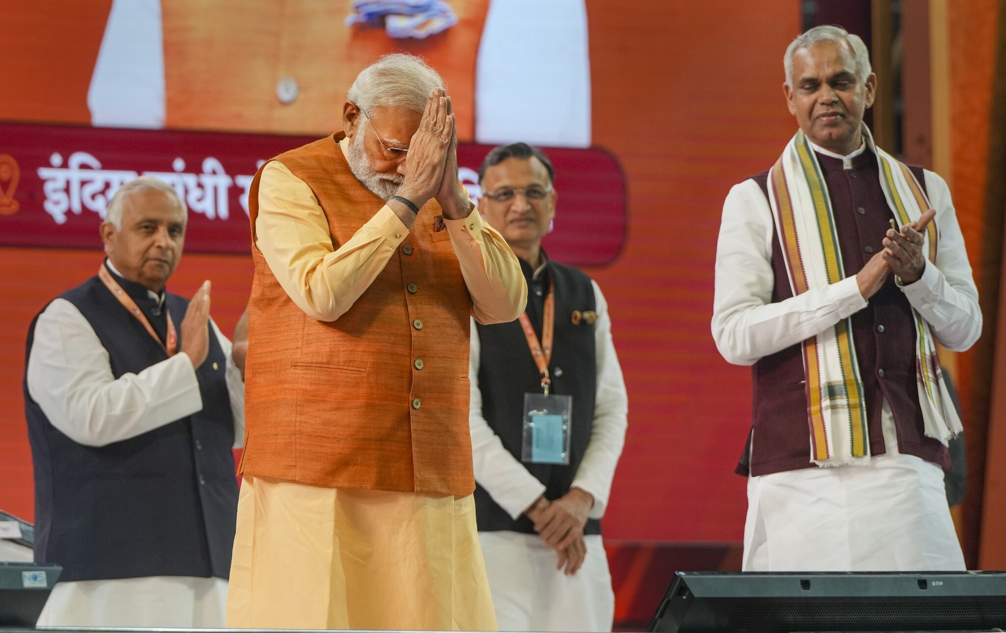 Prime Minister Narendra Modi with Gujarat Governor Acharya Devvrat during the inauguration of the year-long celebrations to mark the 200th birth anniversary of Maharishi Dayanand Saraswati, in New Delhi, Sunday, 12 February. (Photo: PTI/Atul Yadav)