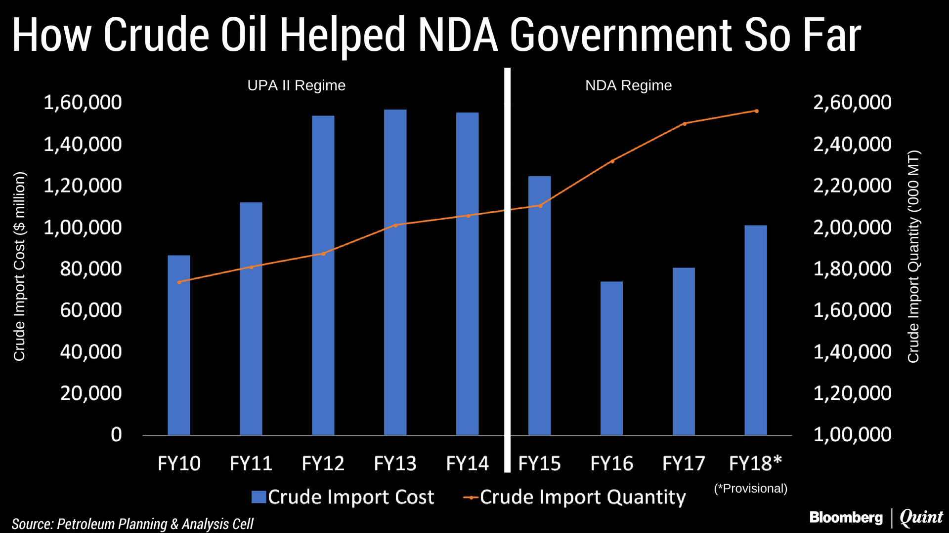 That's because India's average oil imports rose 25 percent a year during Modi's term compared with that of predecessor Manmohan Singh's second stint, according to Petroleum Planning & Analysis Cell. Yet, the yearly oil import bill has fallen by about 28 percent since 2014.