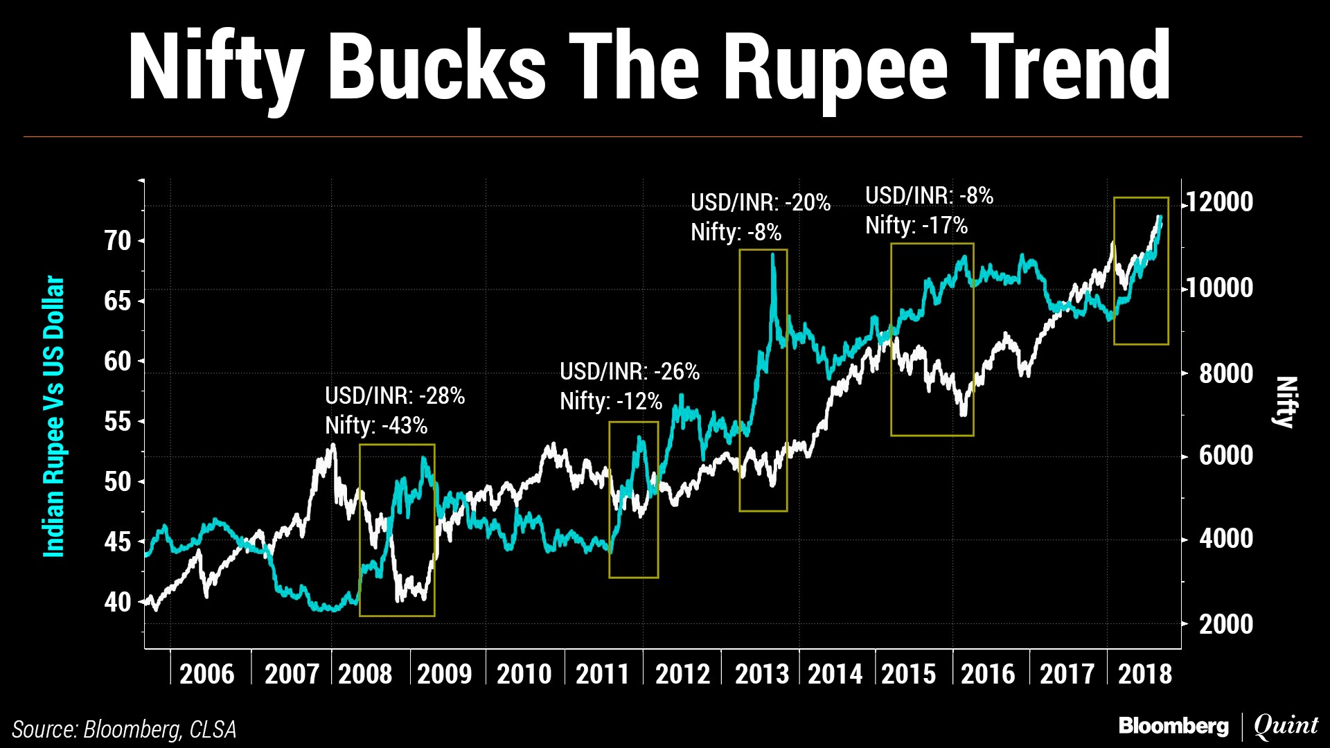 • August 2011-June 2012: Rupee depreciated 26 percent; Nifty lost 12 percent.