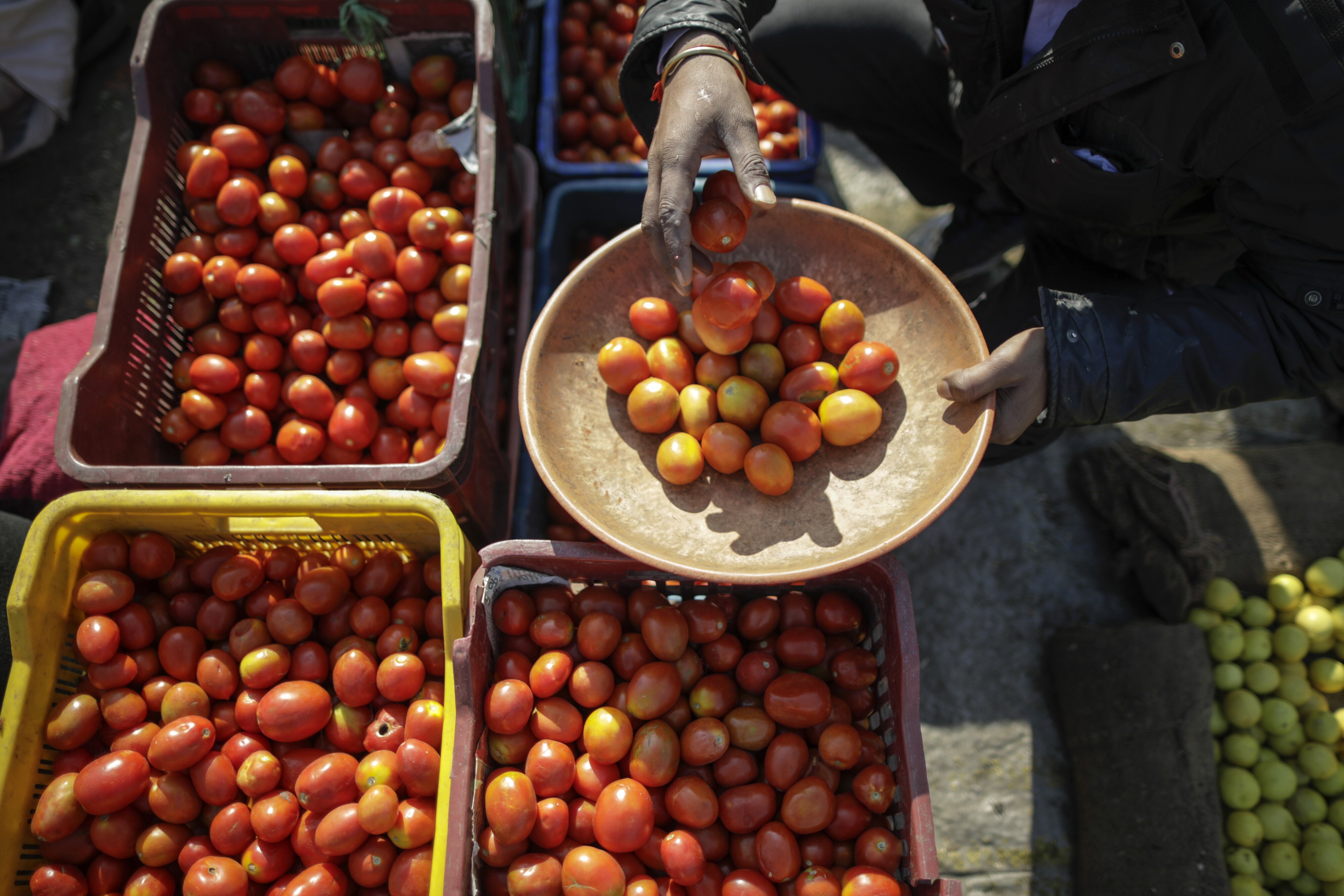A vendor fills a bowl with tomatoes at a vegetable market in India. (Photographer: Prashanth Vishwanathan/Bloomberg)