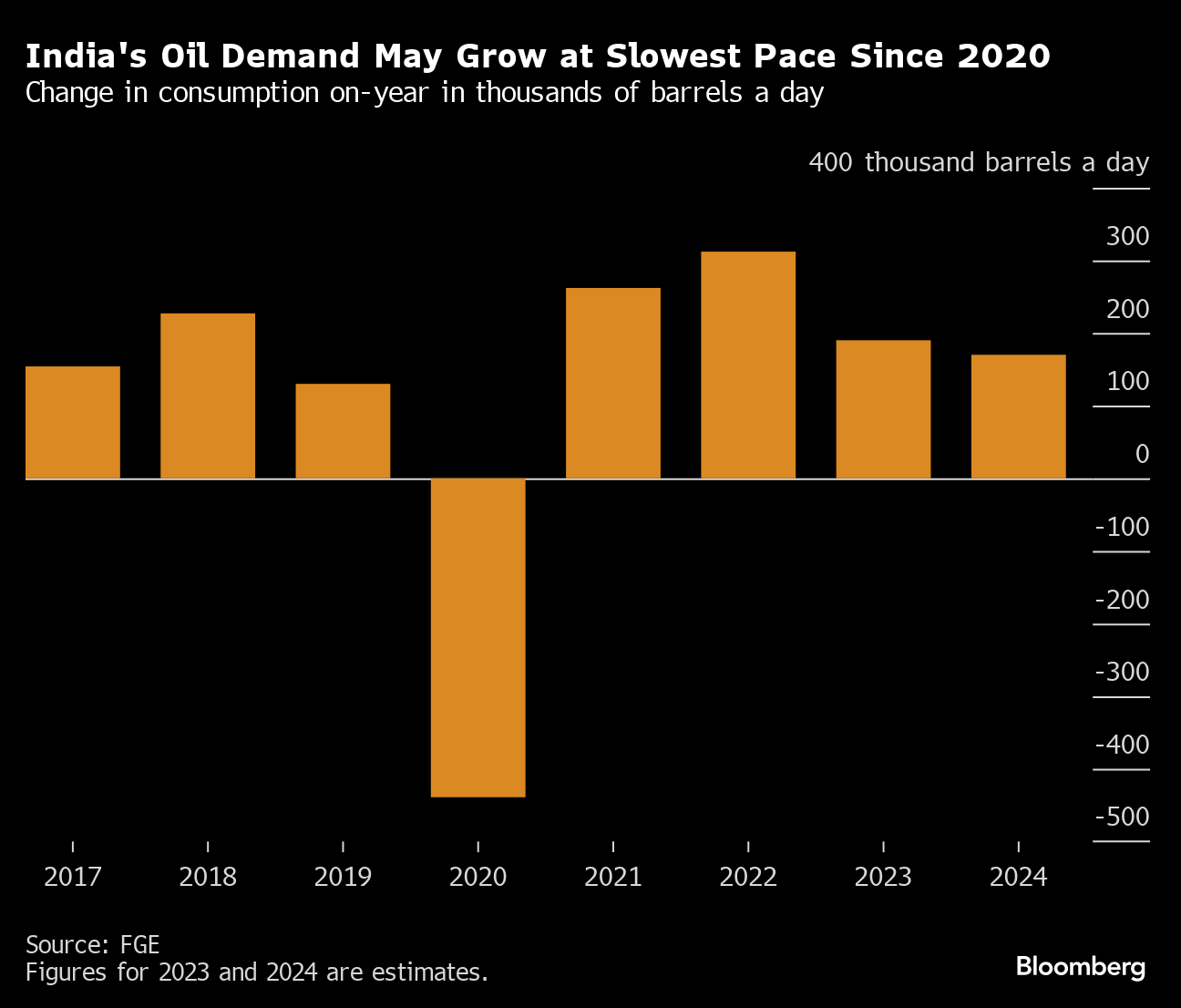 Consultancy FGE is also among those forecasting a slower pace of Indian demand growth in the new year. Dylan Sim, a senior analyst, sees consumption expanding by 20,000 barrels a day less than in in 2023.