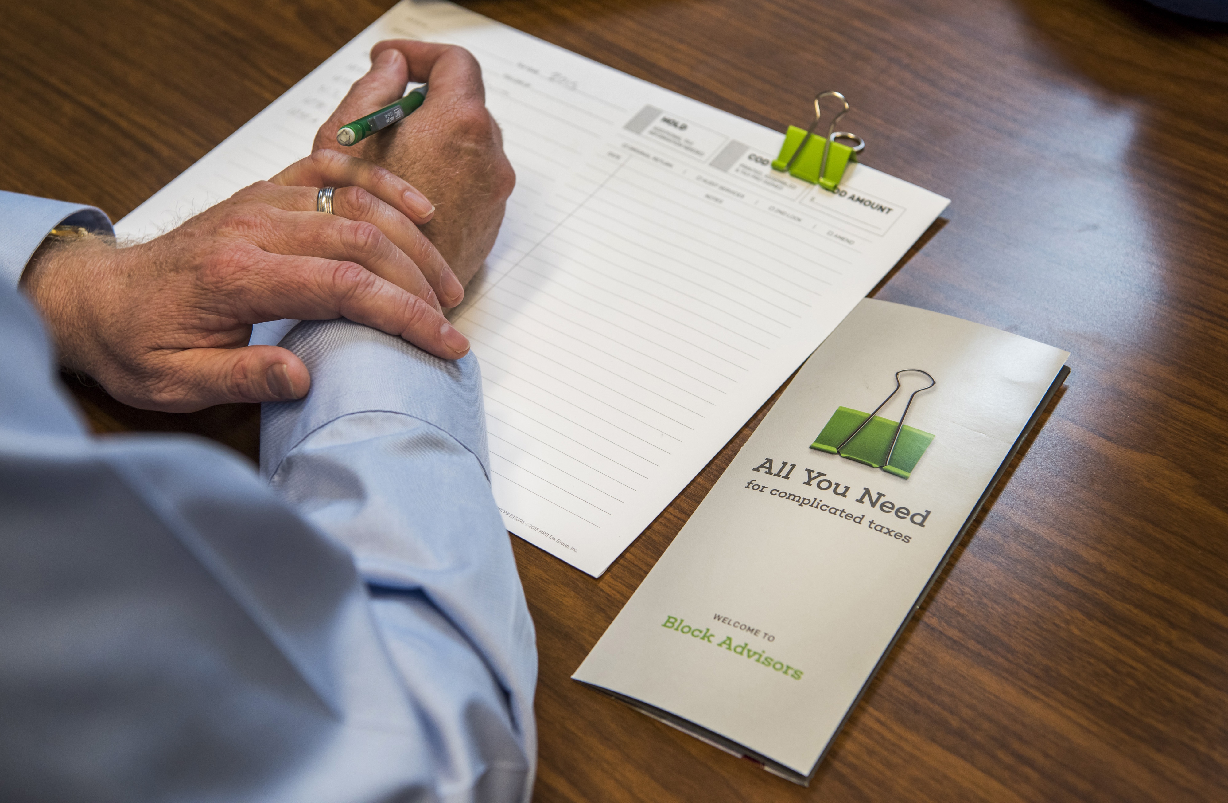 A customer prepares to fill out tax forms at a Block Advisors office in San Francisco, California, U.S. (Photographer: David Paul Morris/Bloomberg)