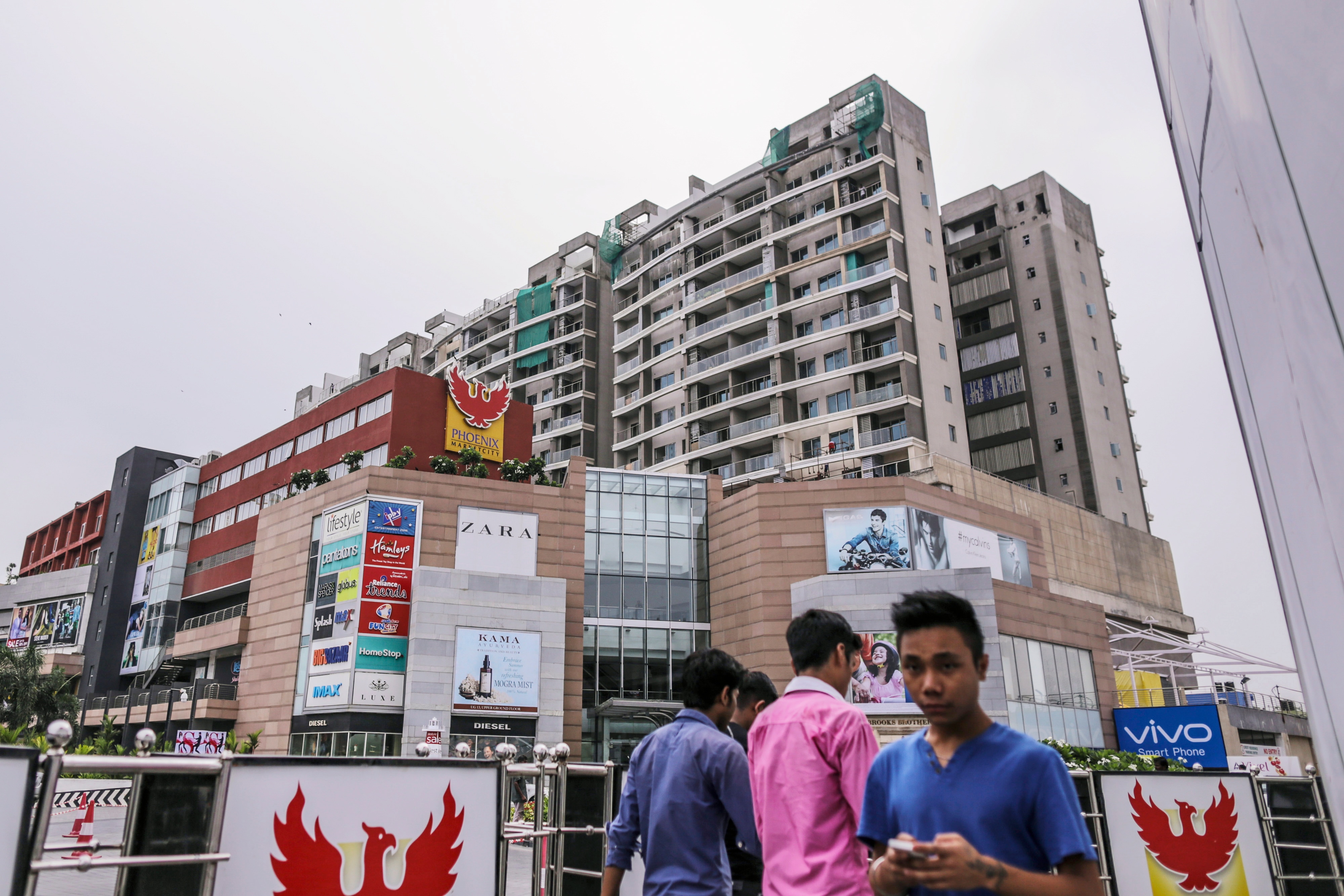 Pedestrians walk past Phoenix Market City shopping mall, developed by Phoenix mills Ltd., in Chennai. (Photographer: Dhiraj Singh/Bloomberg)