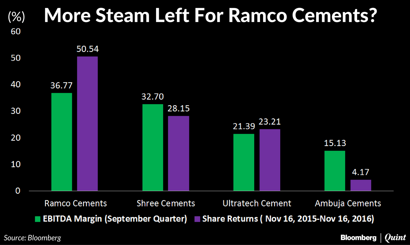 Share prices of most cement companies have risen by 5-30 percent over the last year. However, if there's one stock that's outperformed its peers it's Ramco Cements. The stock rose 50 percent over the last year compared to a 26 percent gain in UltraTech, 23 percent in Shree Cement and 4.17 percent in Ambuja Cement.