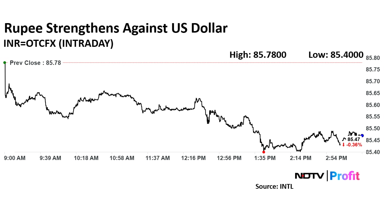 The rupee opened 13 paise higher at 85.66 against US dollar. In the second half of the trade, the Indian unit jumped 38 paise to the day's high of 85.41 against the US dollar.