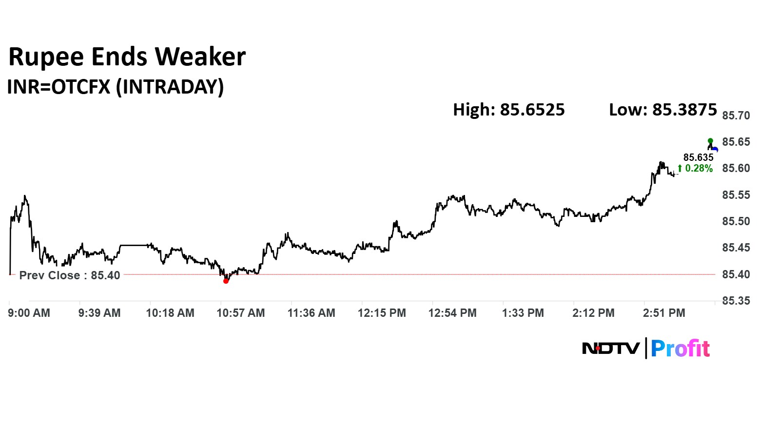 The Indian rupee continued its downward trend, closing 24 paise weaker at Rs 85.64 against the US dollar on Tuesday, compared to its closing value of Rs 85.40 on Monday.