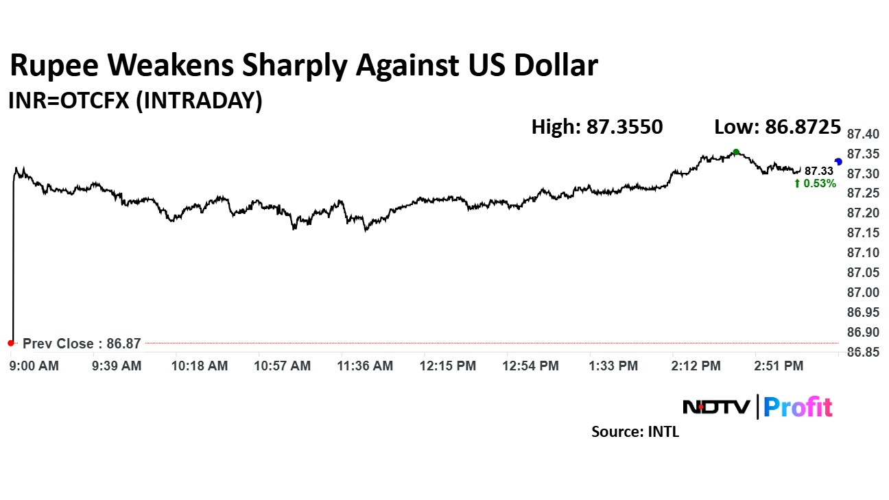The rupee ended near one-week low against the US dollar on Monday, amid persistent demand for the greenback as risk-off sentiment increased among investors on tariff fears. It ended 45 paise lower at 87.33 against US Dollar, the lowest level since March 4.