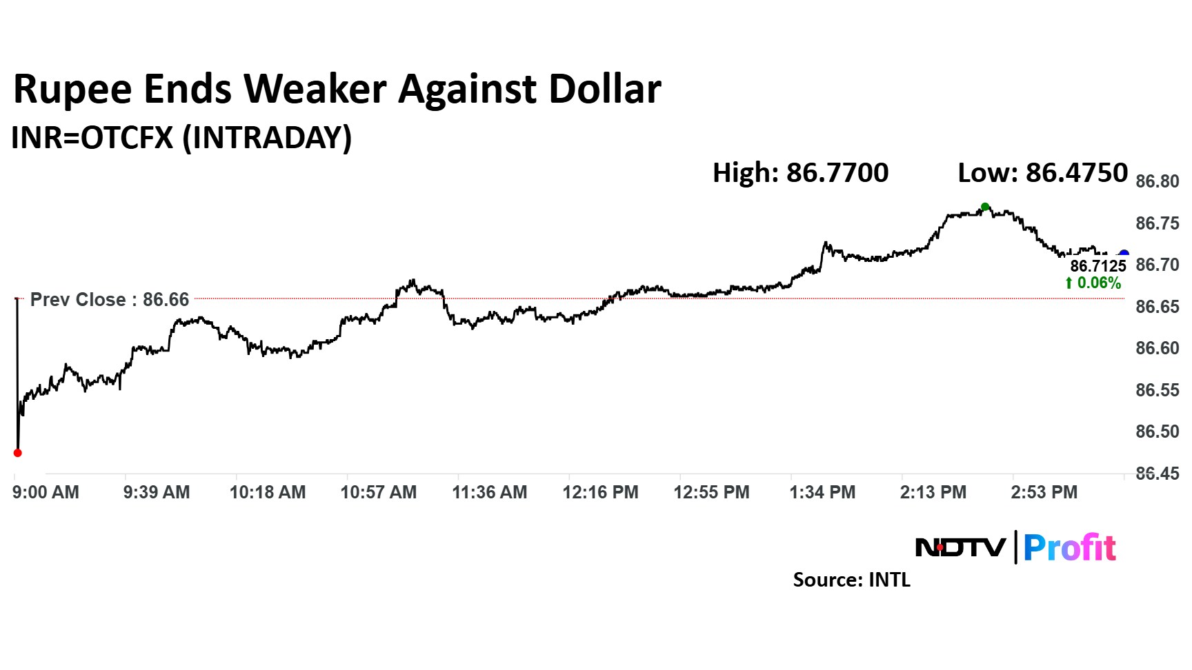 The Indian rupee ended weaker against the US dollar on Friday. The local currency closed 5 paise lower at Rs 86.71 against the greenback, according to Bloomberg. It had opened stronger at Rs 86.48, after closing at Rs 86.66 on Thursday.