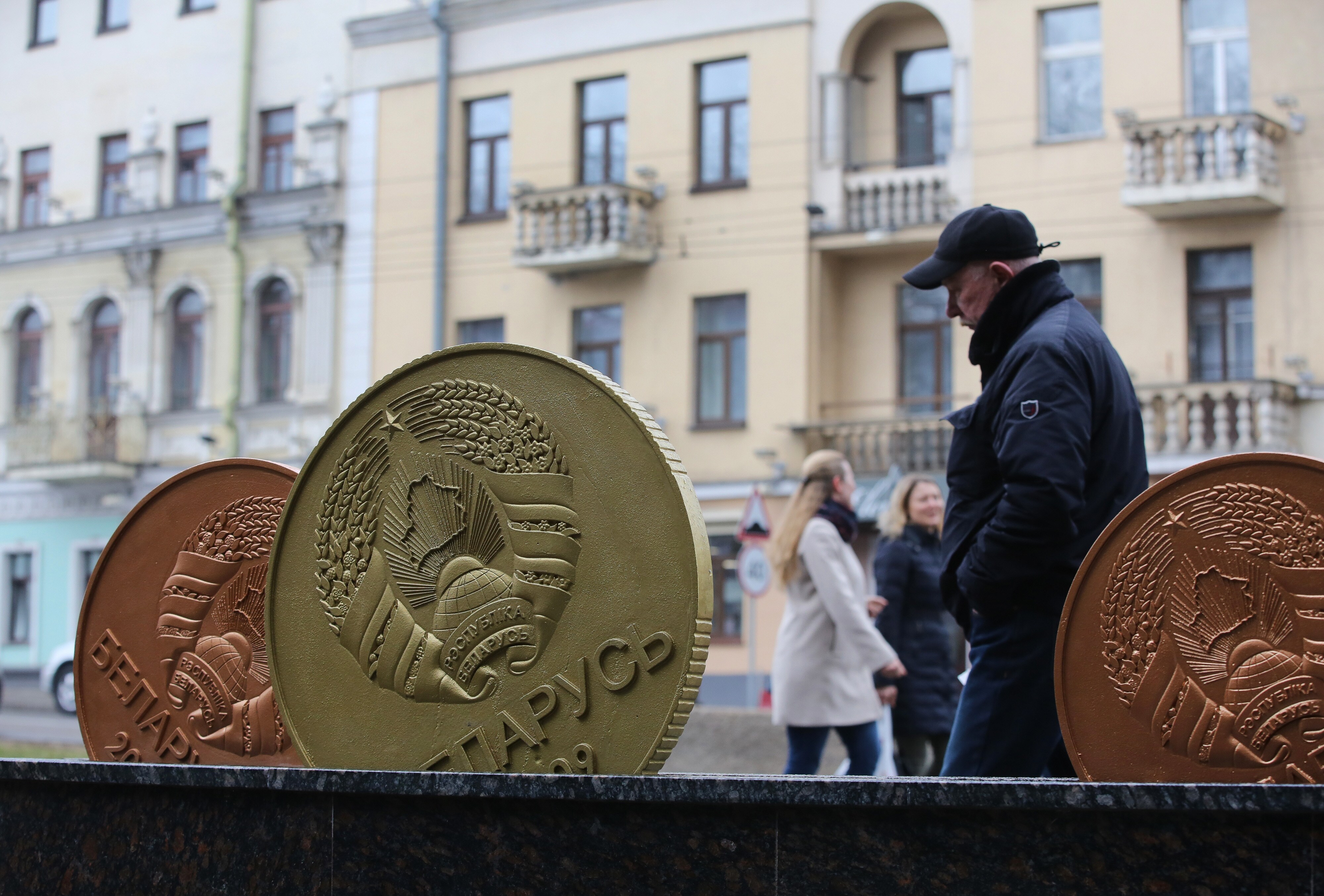 Pedestrians pass a street sculpture representing Belarussian ruble currency coins near the finance ministry in Minsk, Belarus. (Photographer: Andrey Rudakov/Bloomberg)