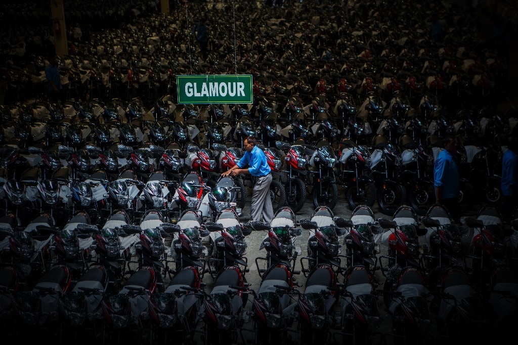 A worker arranges motorcycles for shipping under a banner for the Hero Glamour motorcycle model in the dispatch bay of the Hero MotorCorp Ltd. manufacturing facility in Gurugram, India (Photographer: Prashanth Vishwanathan/Bloomberg)