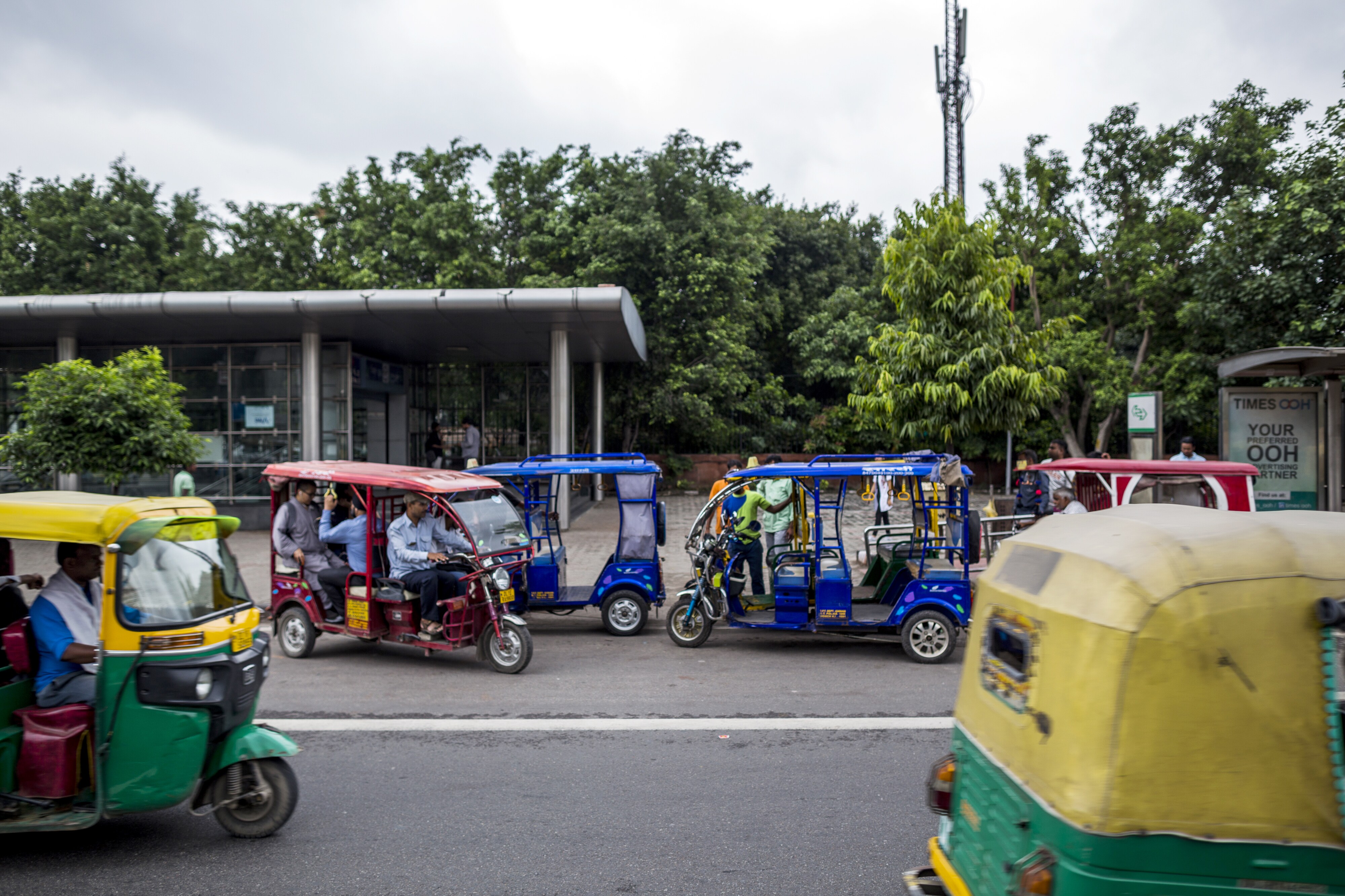 Auto rickshaws, foreground, travel past an e-rickshaw departing a stand in New Delhi, India, on Saturday, Sept. 22, 2018. (Photographer: Prashanth Vishwanathan/Bloomberg)