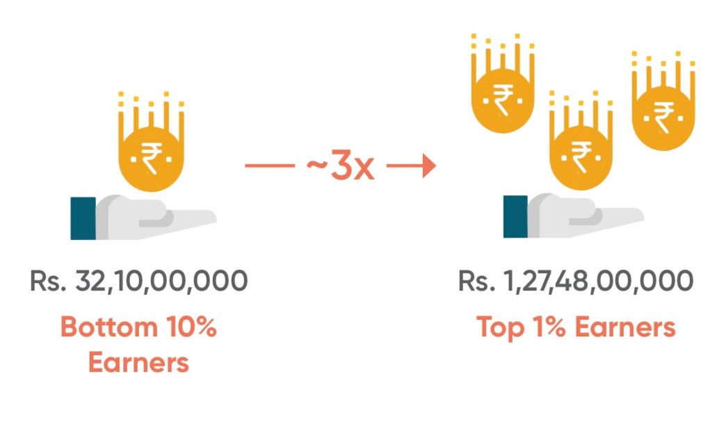 The top 1% of income earners in India cumulatively earn more than three times of what is earned by the bottom 10%. The share of the top 1% in income increased to 6.8% as of 2019-20. The 10% earned 30-35% of total income.