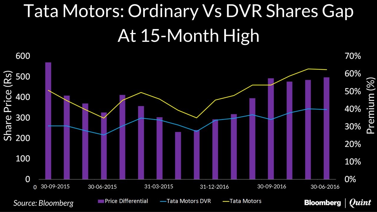 The ordinary shares of Tata Motors have been trading 58 percent higher that the company's differential voting rights (DVR) shares, bringing the gap between the two to its highest in 15 months. On average in the last 15 months, the ordinary shares have traded at a 45 percent premium to the DVR shares.