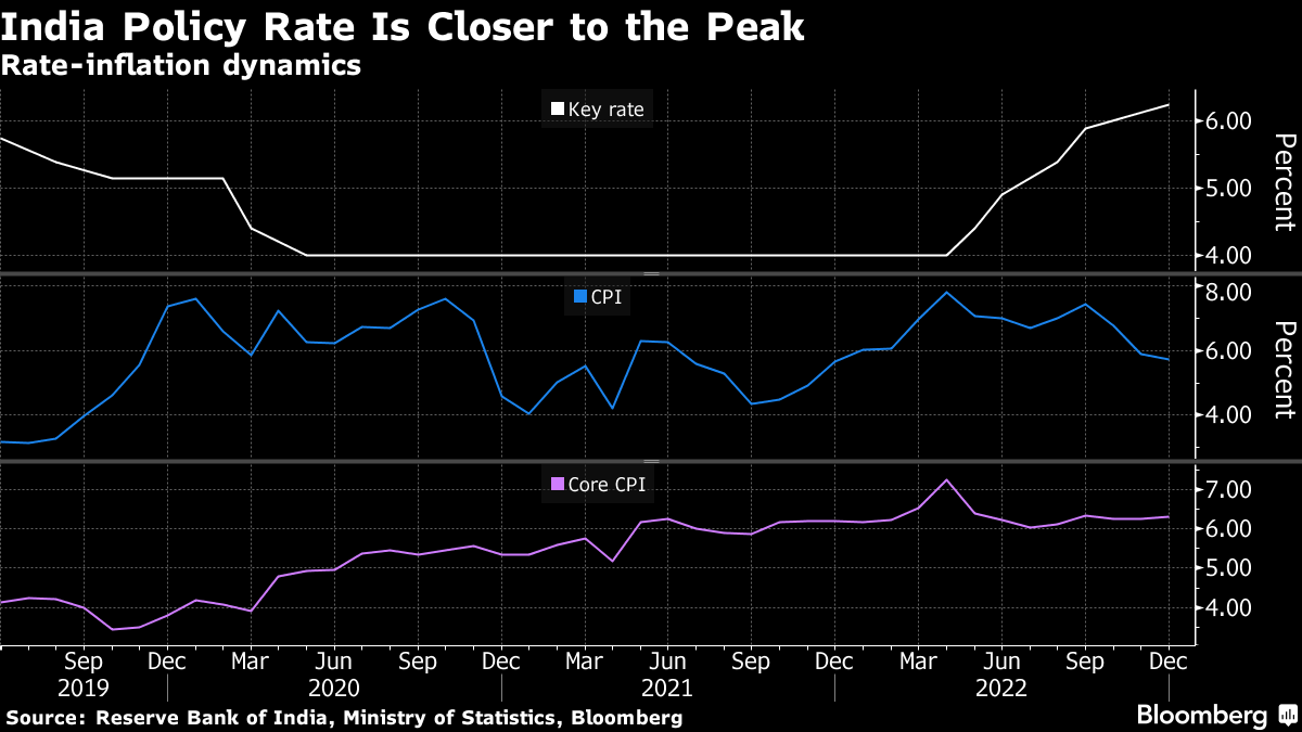 The median of economists surveyed separately for the year-ahead outlook predict the rates terminating at 6.50% this quarter and the MPC standing pat for the rest of the year. That projection is based on expectation consumer-price growth, which returned to the RBI's 2%-6% target in November, will stay within that range in 2023.
