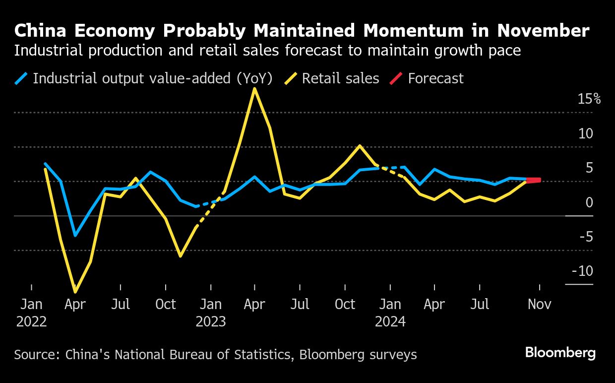The week will begin with a slew of data from China that will be closely monitored for signs that the world's second largest economy is being lifted by government stimulus efforts. Industrial production and retail sales data will be key to watch.