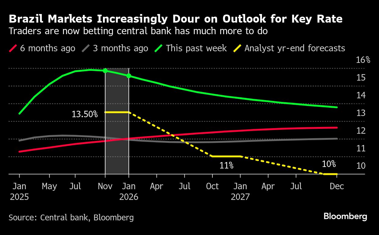 Economists see the key rate at 13.5% by this time next year from the current 12.25%, while markets are pricing in a 2025 year-end rate that's more than 200 basis points higher.