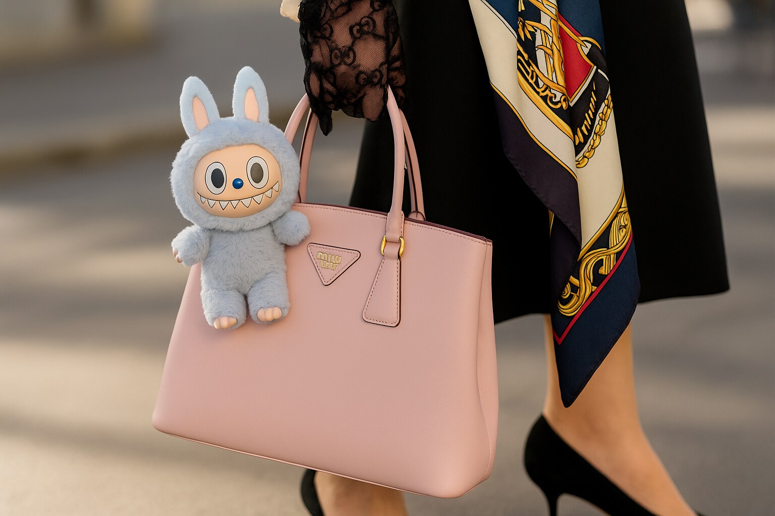 Imagine this: silk Prada scarves, Dior kitten heels, and a Miu Miu bag, but with a plush toy peeking out, all big eyes, pastel fur, rabbit ears, and a toothy grin. It's playful, it's cute-ish, and it's pure recession-core couture.
