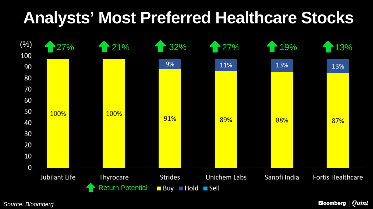 Unichem Laboratories Ltd., Sanofi India Ltd. and Fortis Healthcare Ltd. complete the list of top six with an expected upside of 13-27 percent.