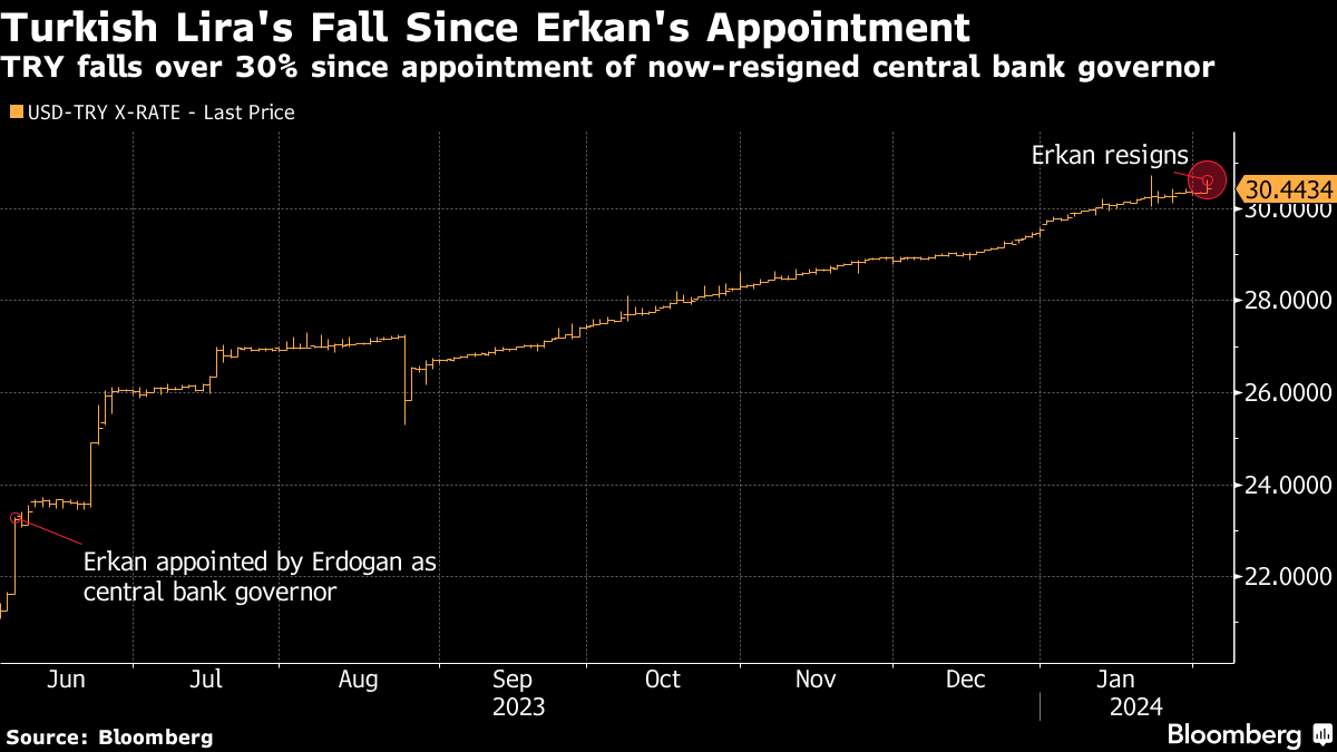The Turkish lira weakened after Erkan announced that she was stepping down, falling 0.5% to 30.4887 per dollar as of midnight in Istanbul, a record low closing level. The currency has depreciated by about 23% since Erkan and Simsek were appointed by Erdogan to lead the about-face in Turkey's economic policies, which included raising interest rates aggressively and letting the currency trade more freely in an effort to attract foreign investment.