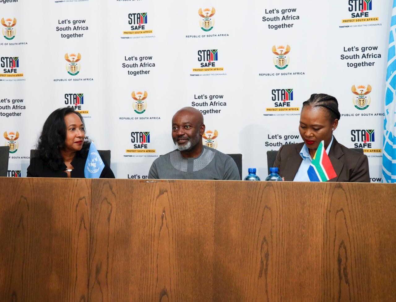 South Africa’s Minister of Small Business Development Stella Tembisa Ndabeni, ITC Executive Director Pamela Coke-Hamilton and UN Resident Coordinator in South Africa, Nelson Muffuh making the announcement .
