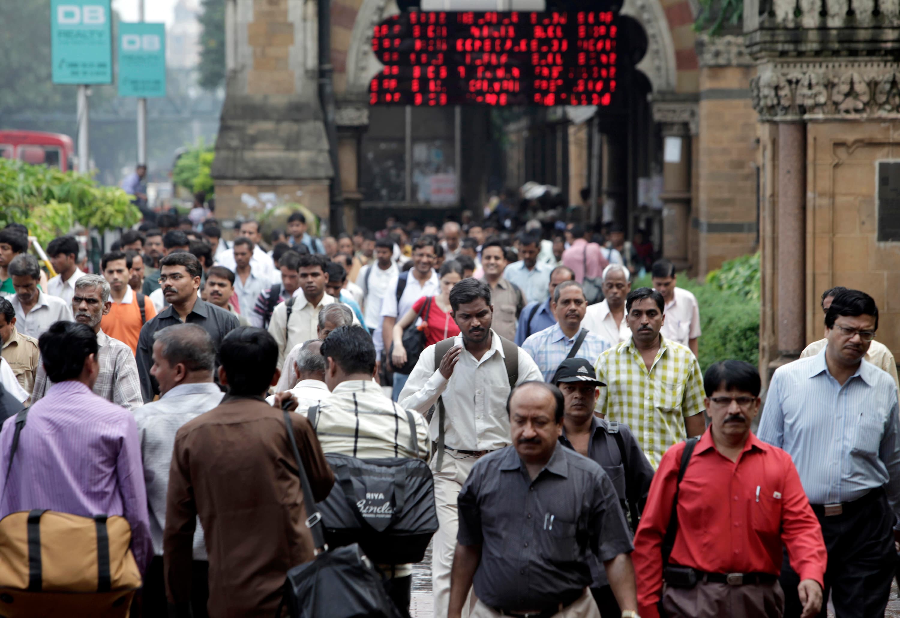 Commuters make their way outside Chhatrapati Shivaji Terminus in Mumbai, India. (Photographer: Kuni Takahashi/Bloomberg)